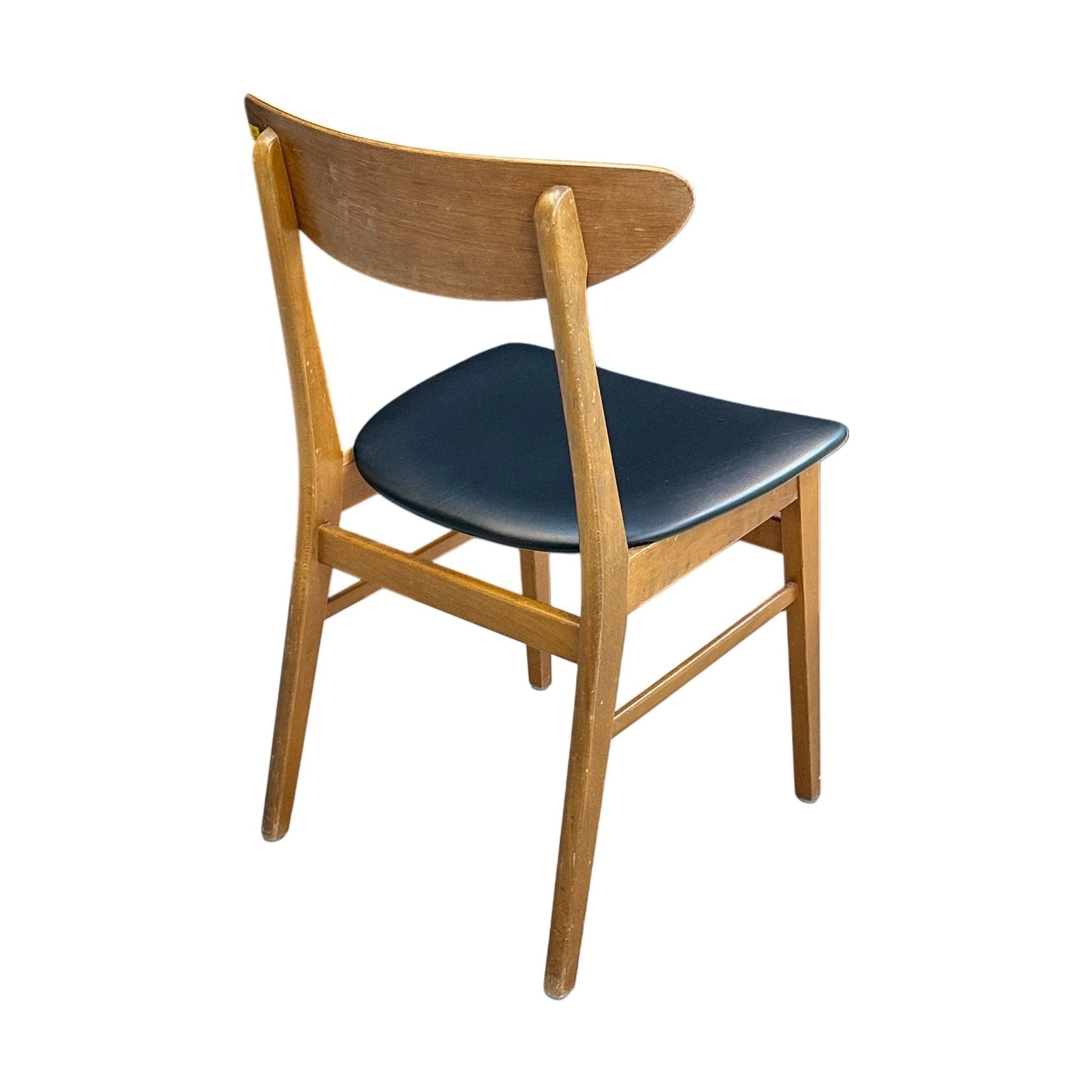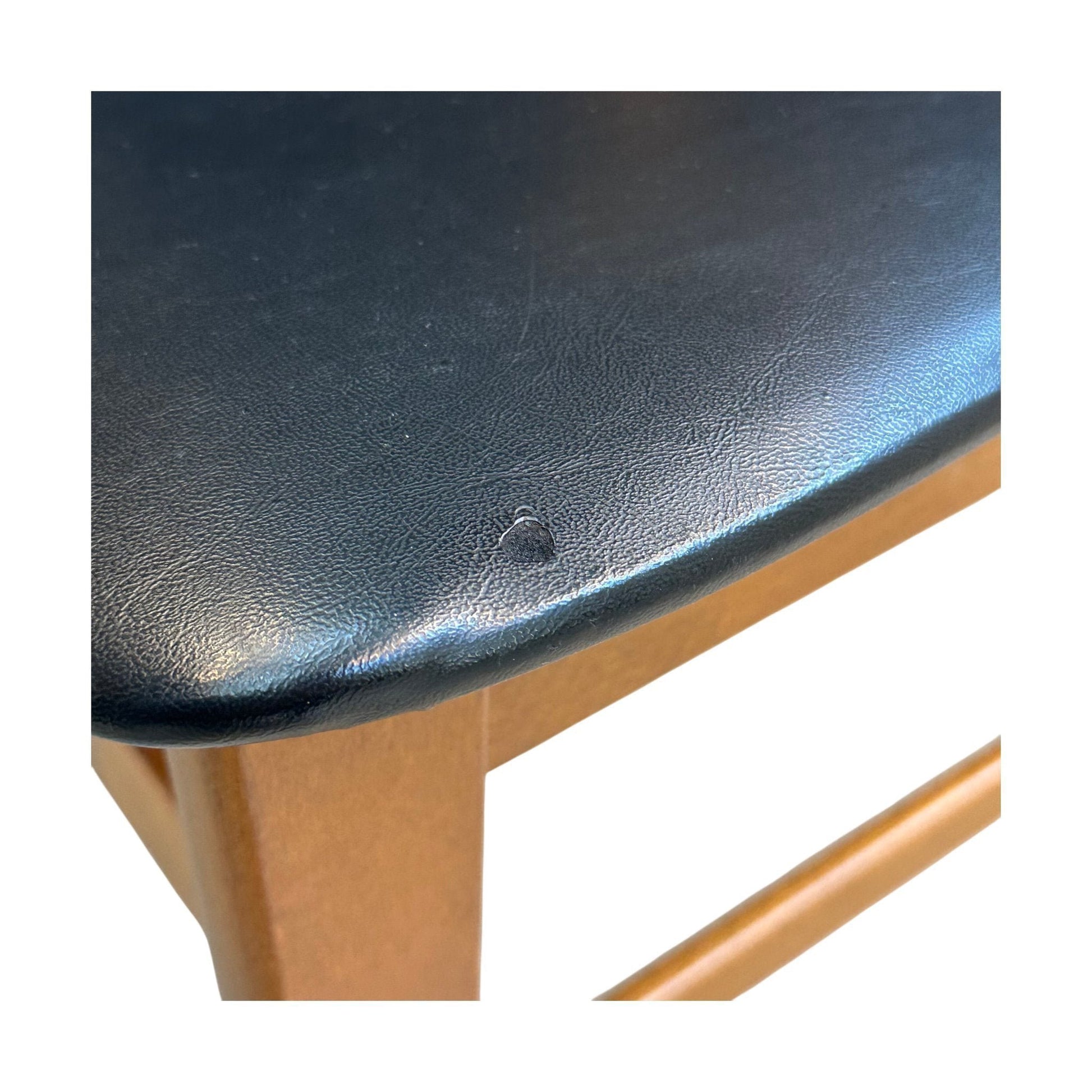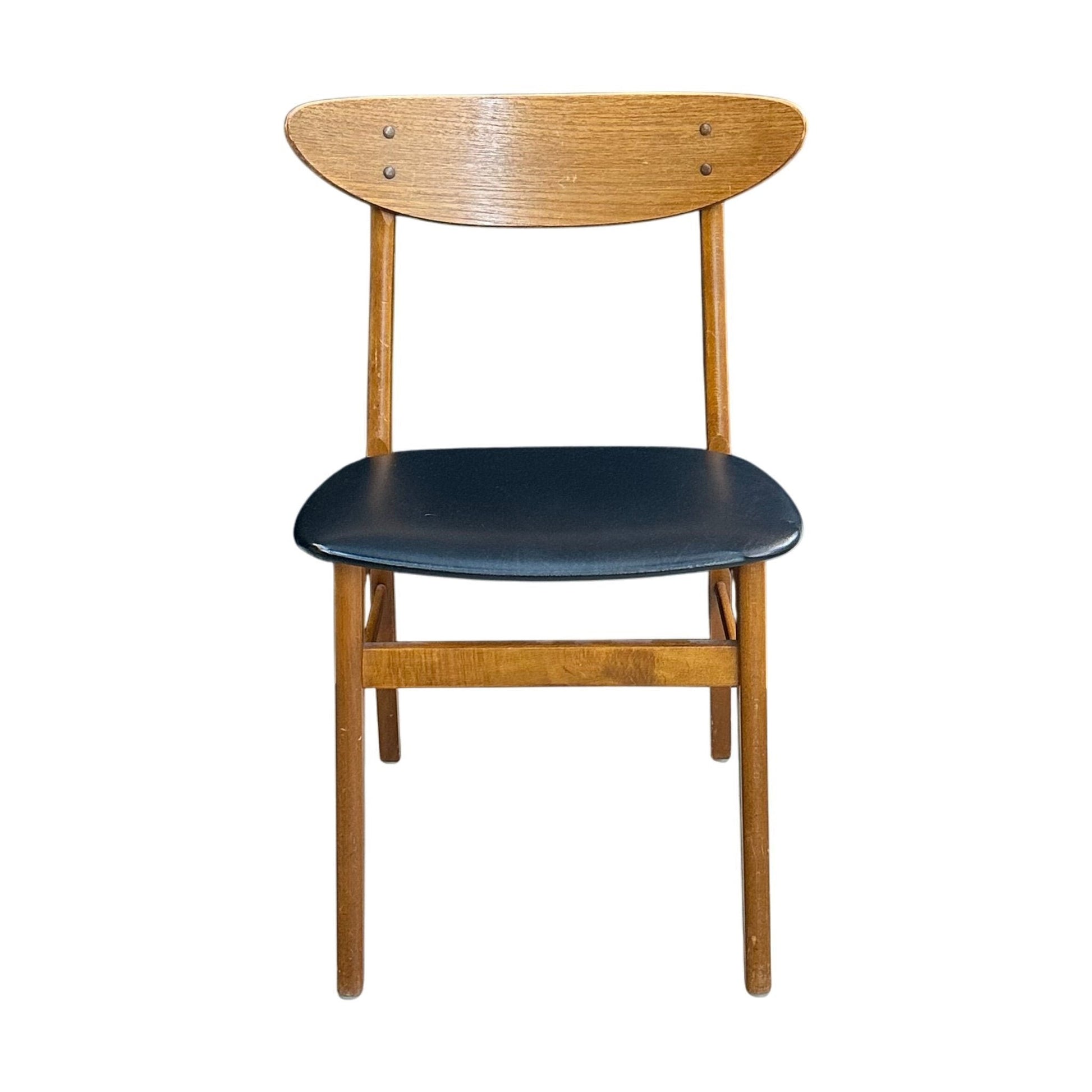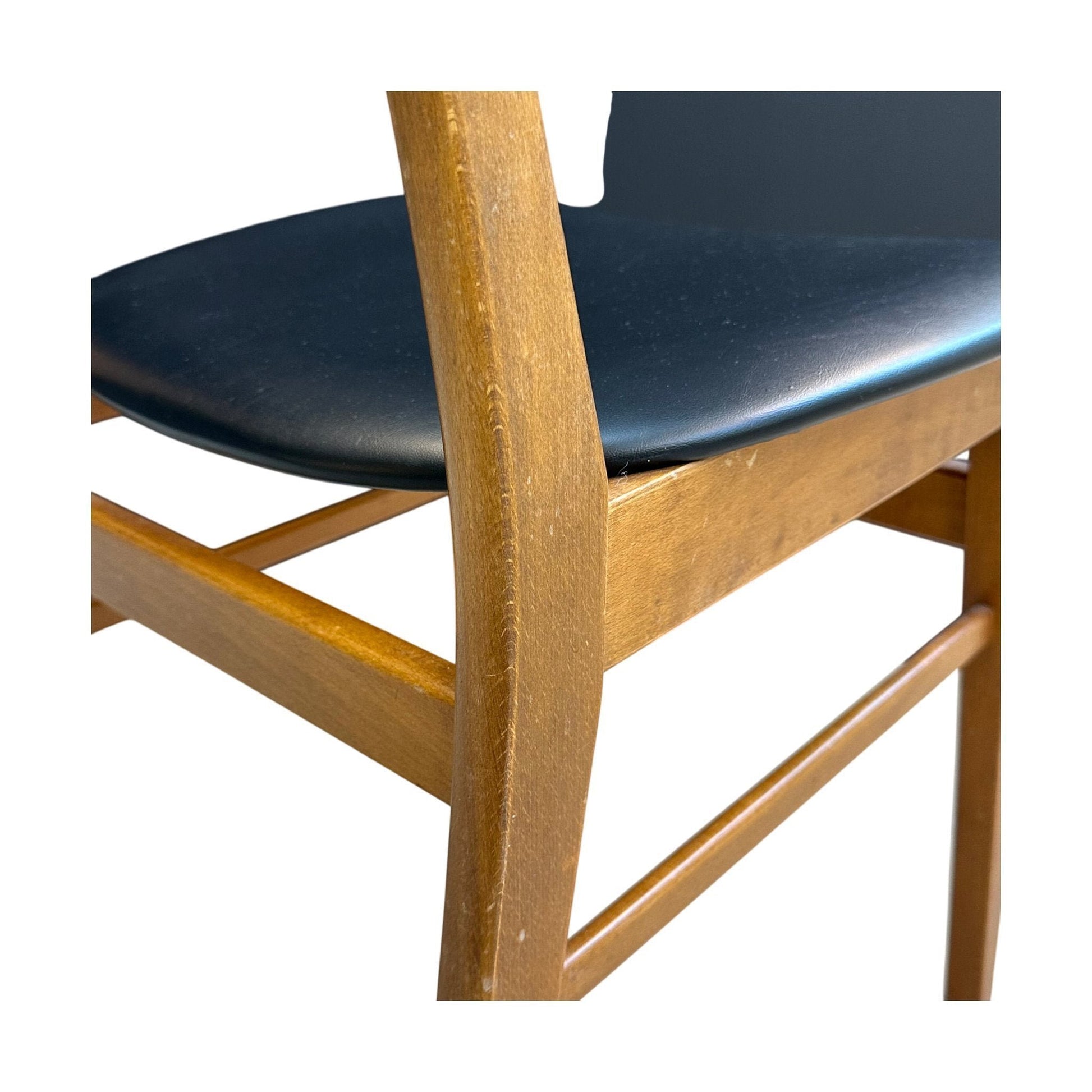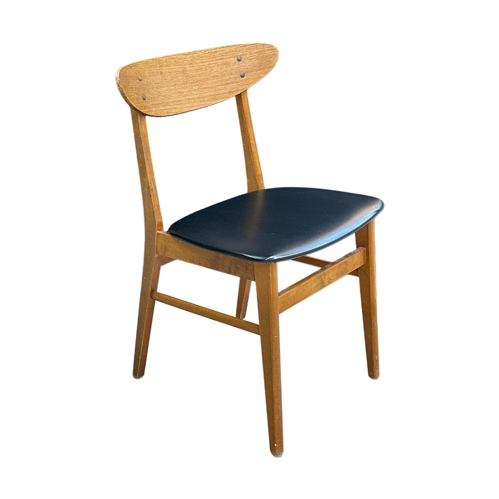Spisestol med naturlig trefinish og svart skinnsete. Den enkle, skandinaviske designen kombinerer funksjonalitet og estetikk, og uthever den varme trestrukturen i ryggen og bena.Denne stolen er perfekt for både moderne og tradisjonelle spisestuer, og dens tidløse stil gjør den også egnet til sosiale områder på arbeidsplassen.