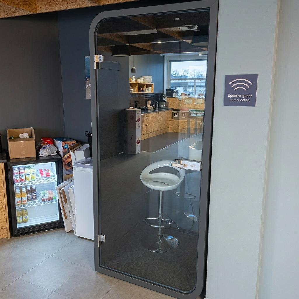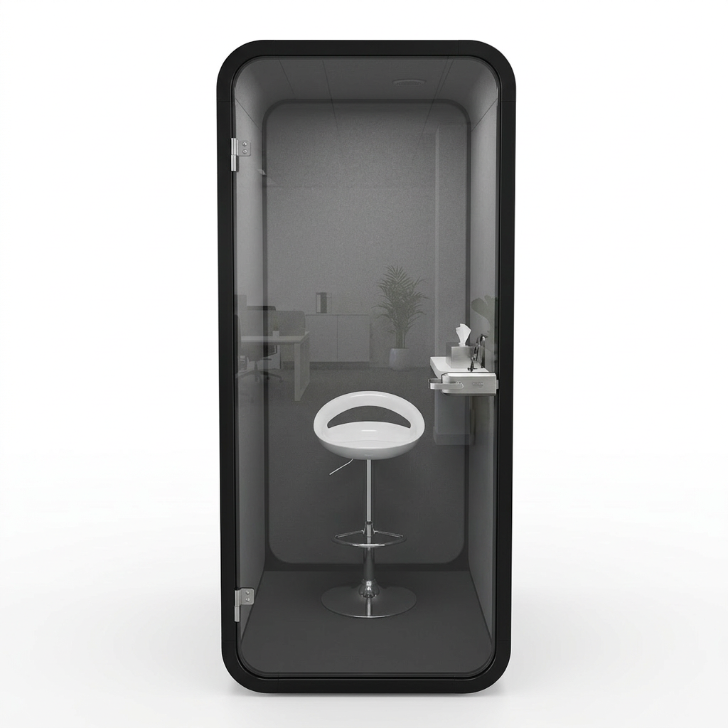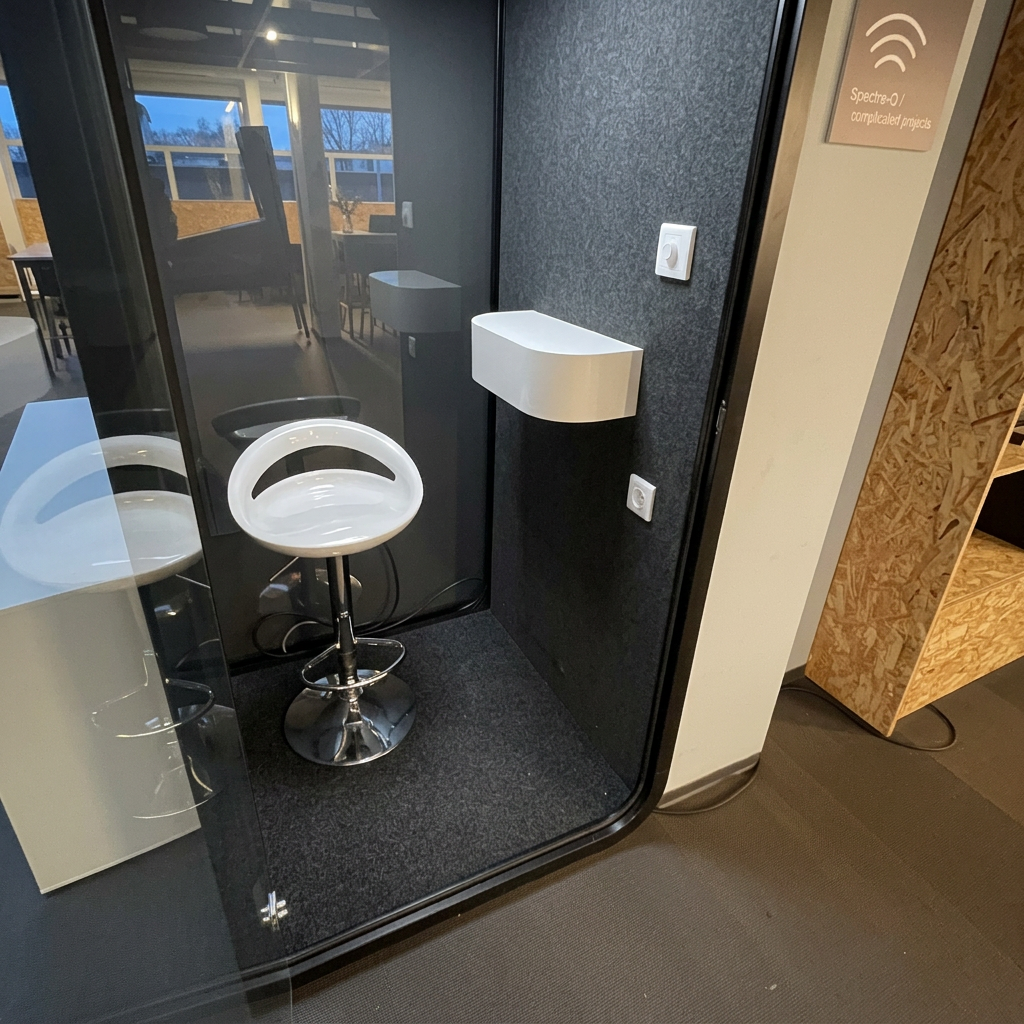 - Funksjoner: Lydisolert, innebygd stol, privat arbeidsområde