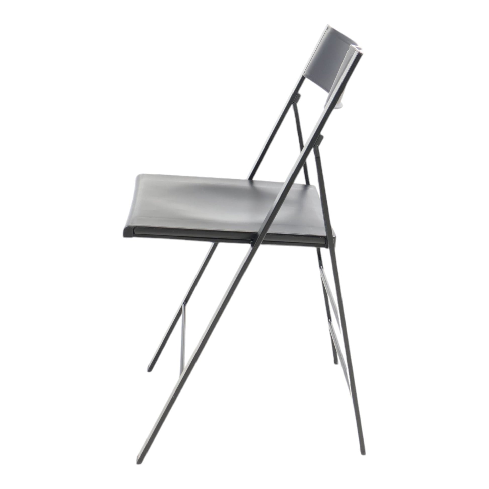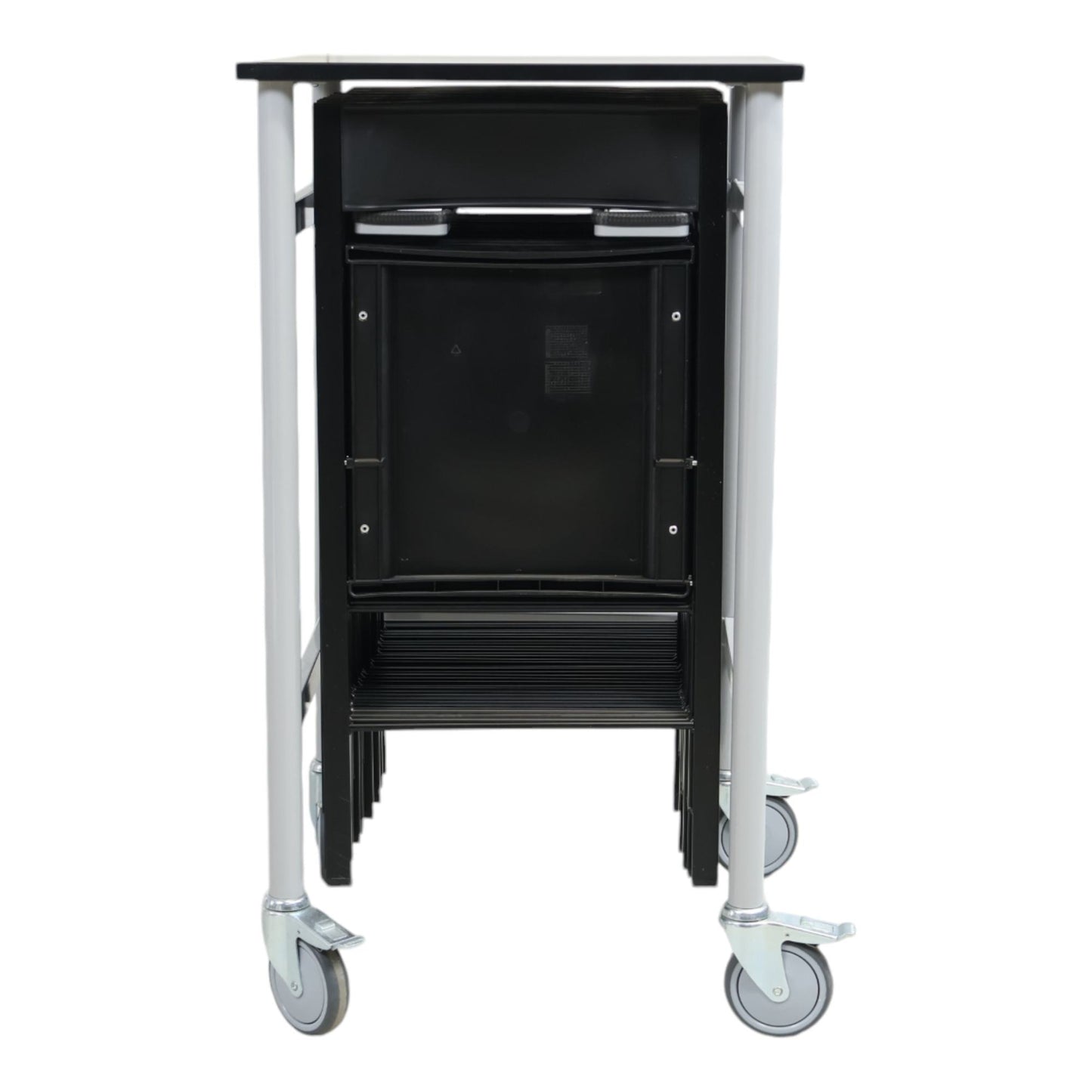 Praktisk stolstativ med 16 sorte klappstoler. Stolene er lette, enkle å oppbevare og passer perfekt til arrangementer eller ekstra sitteplasser. De kan raskt settes opp og stables igjen når de ikke er i bruk.