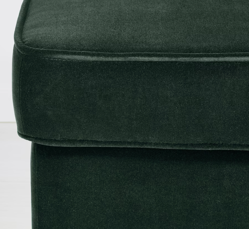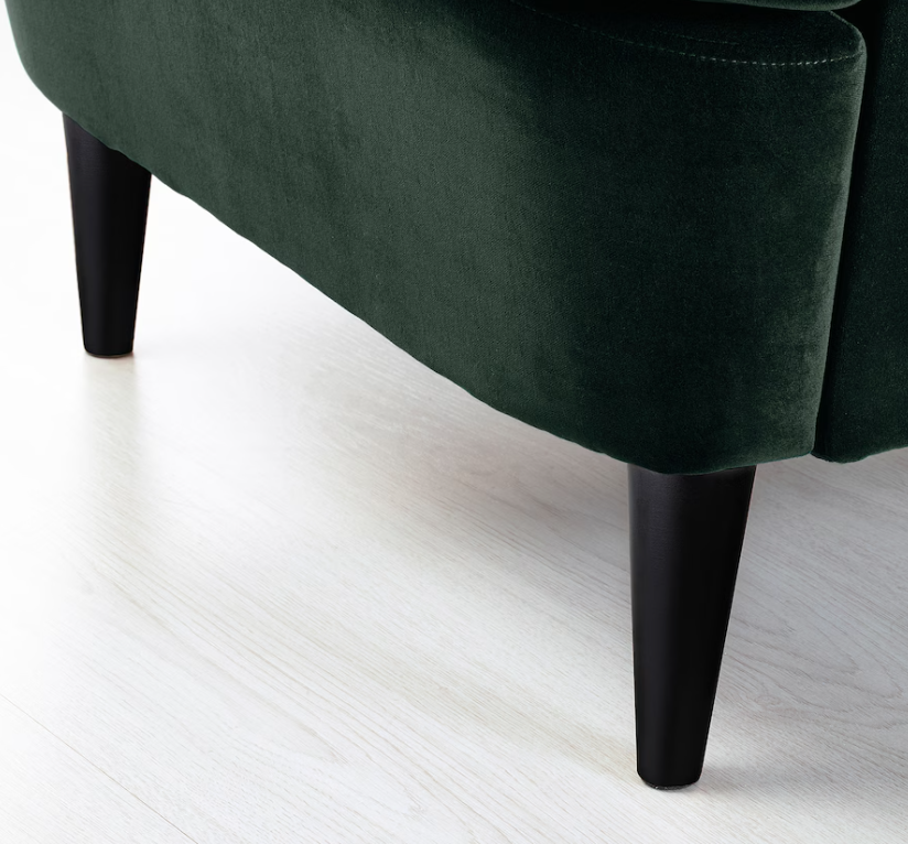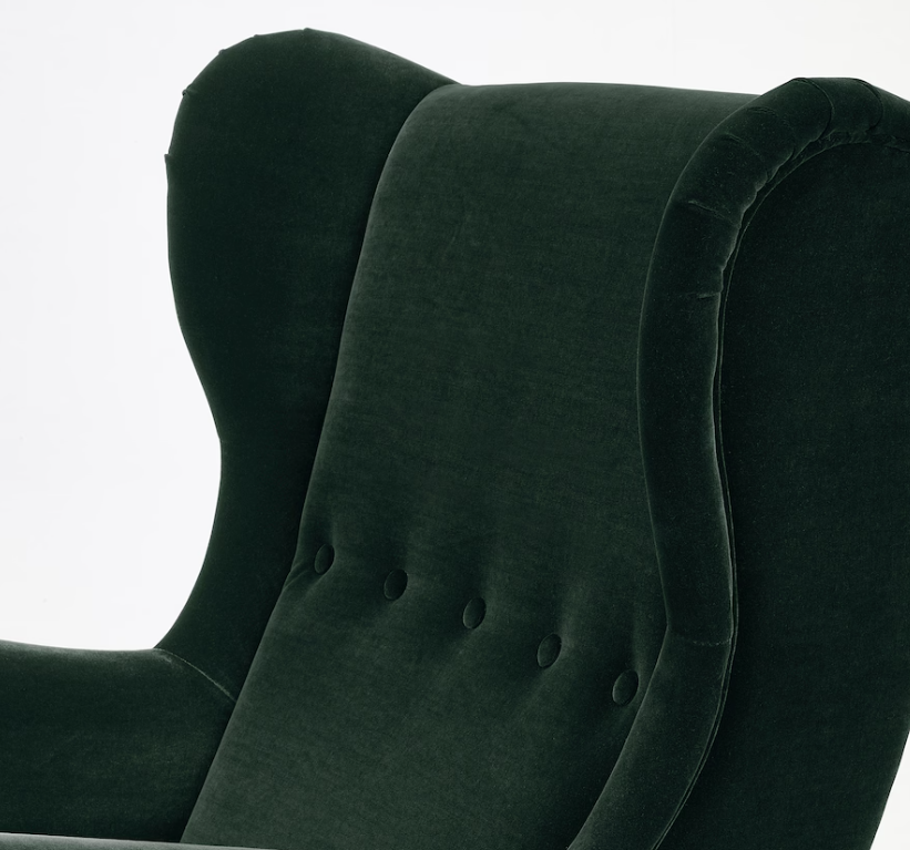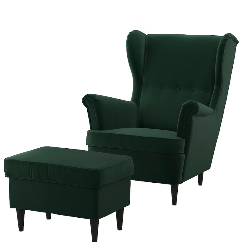 Strandmon lenestol og fotskammel fra IKEA kombinerer tidløst design med moderne komfort, perfekt for avslapning. Den myke fløyelen i en dyp grønnfarge gir en omfavnende følelse, mens den høye ryggen gir utmerket støtte for nakken.