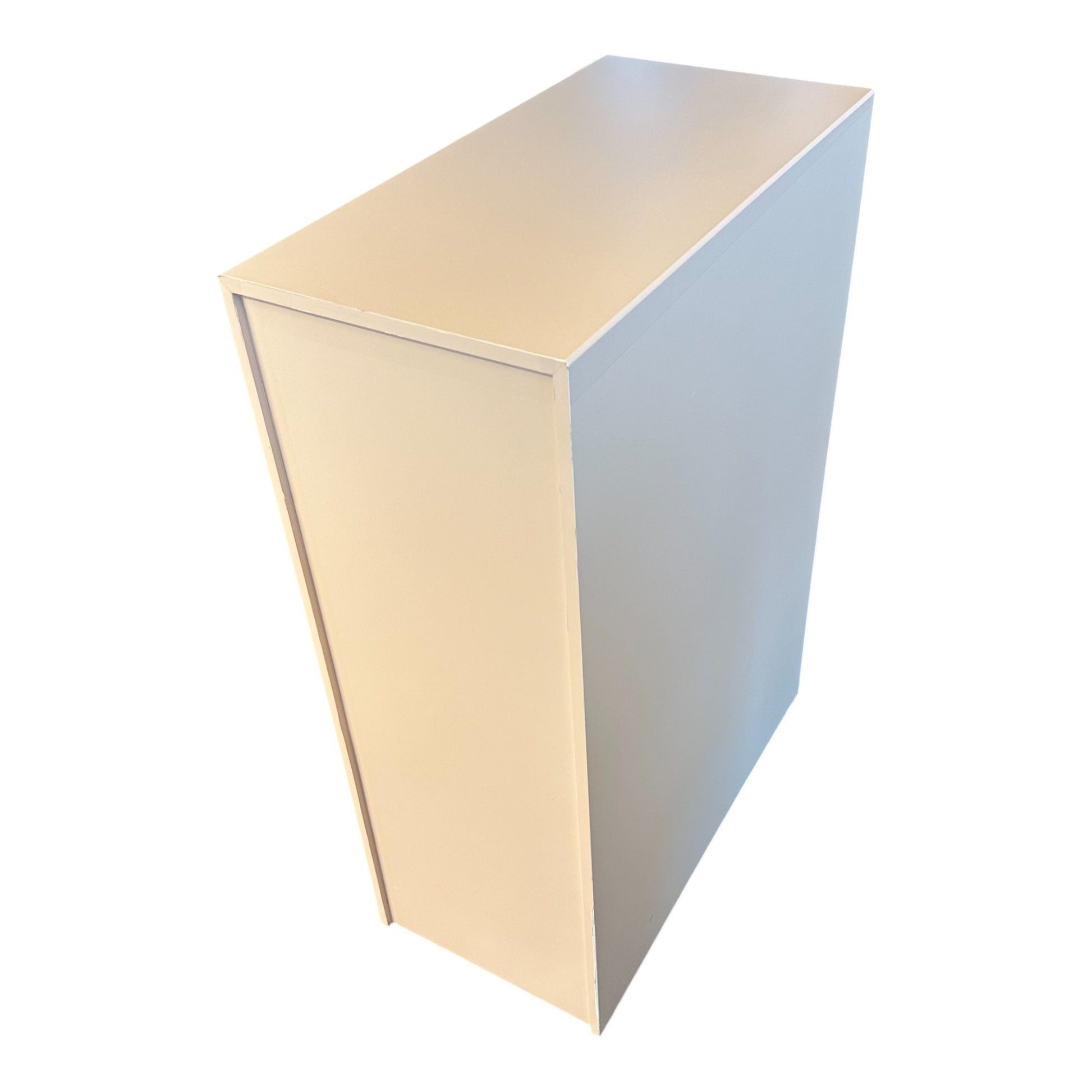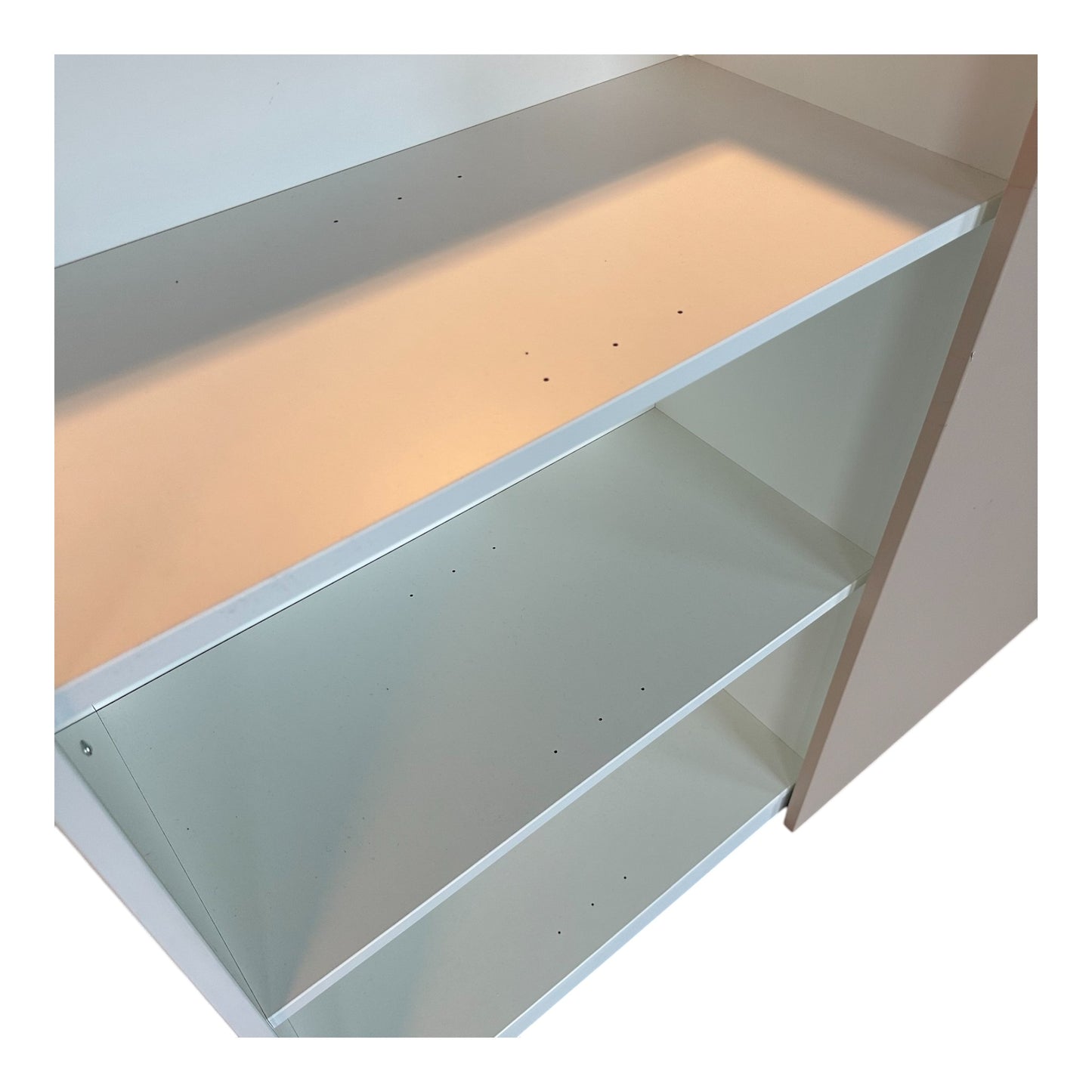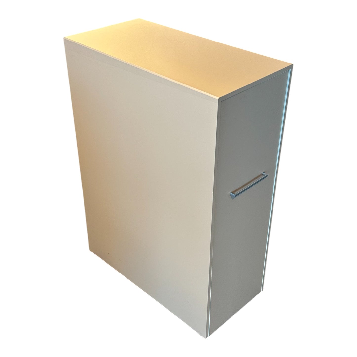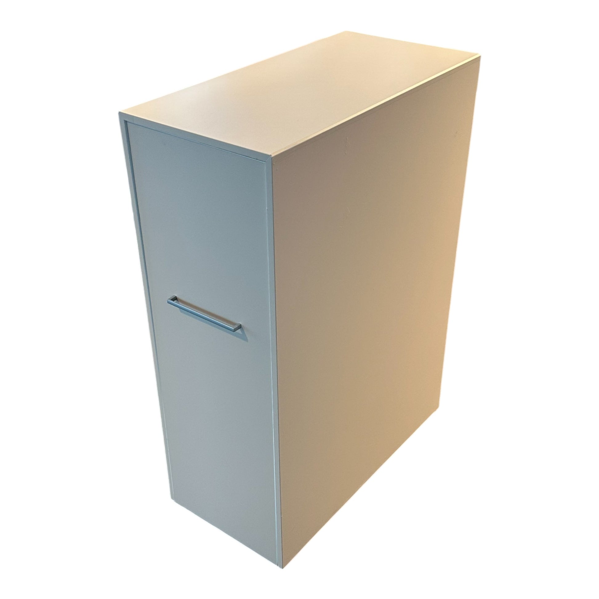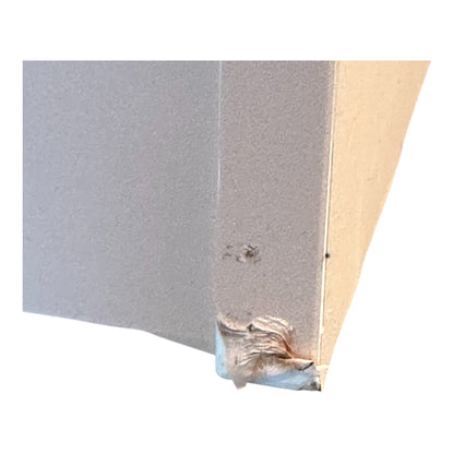 Skapet har noen merker og skader på hjørnene, noe som er vanlig ved bruk, men dette påvirker ikke funksjonaliteten. Laminatoverflaten er enkel å rengjøre og vedlikeholde, noe som sikrer langvarig glede.