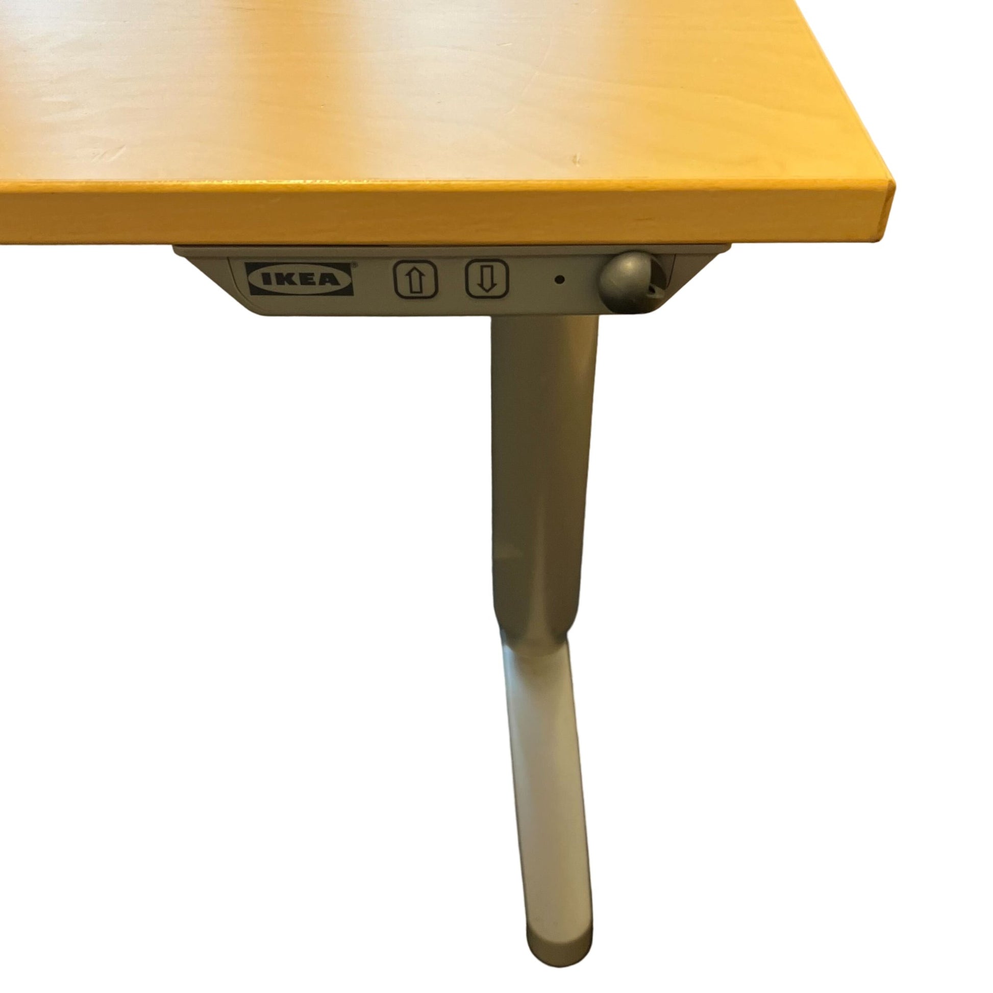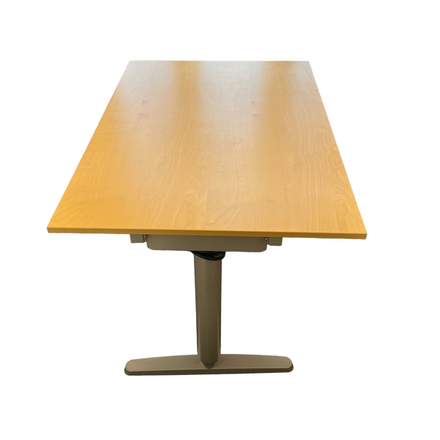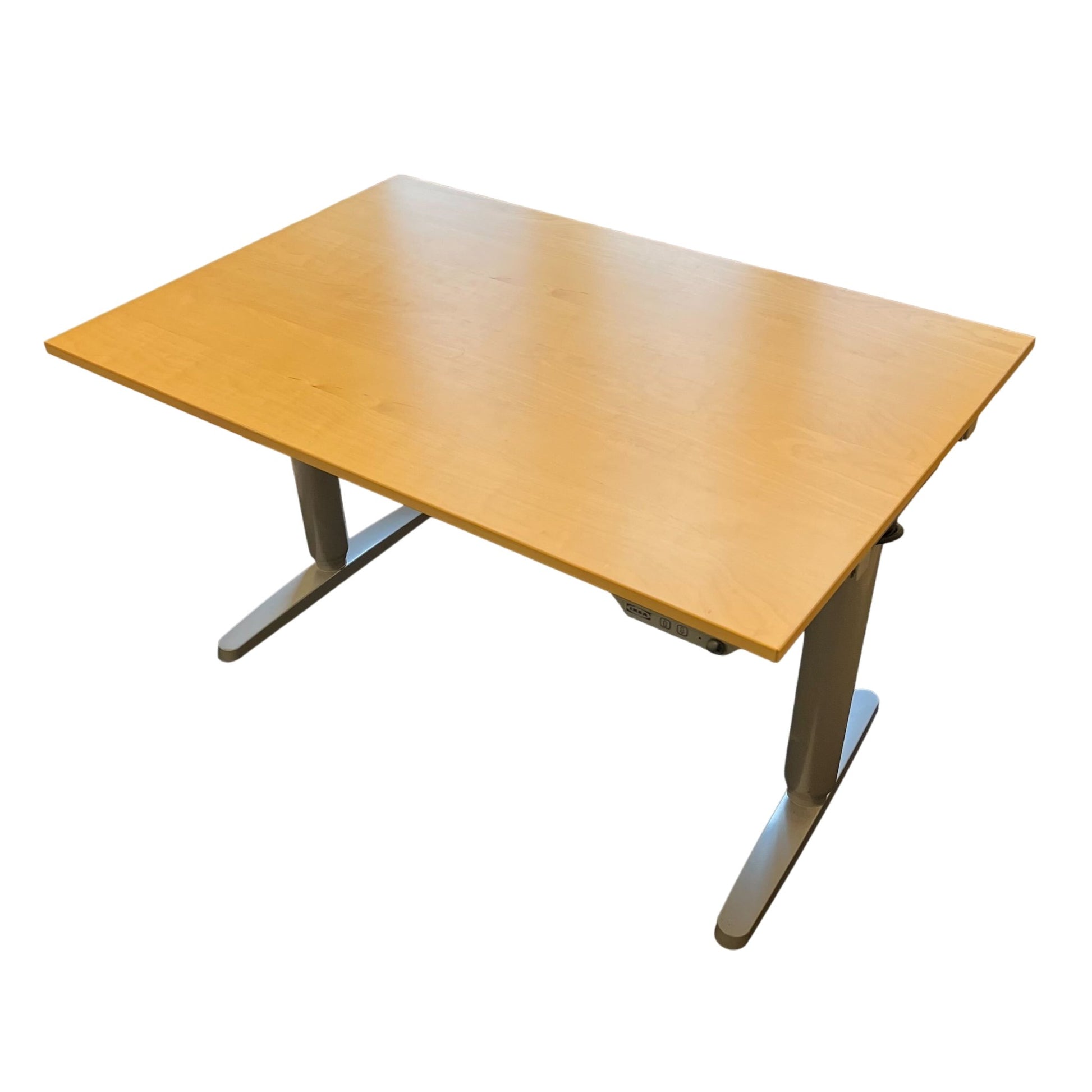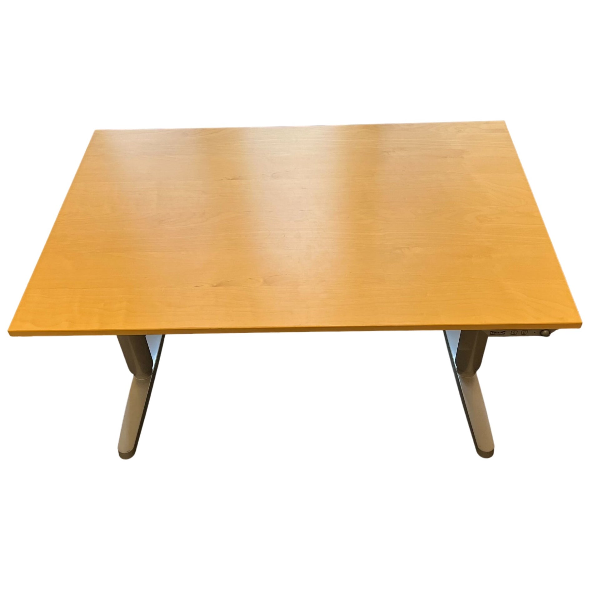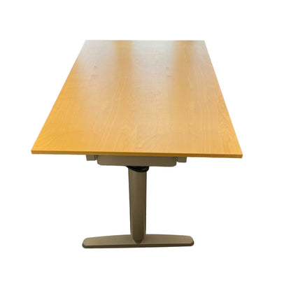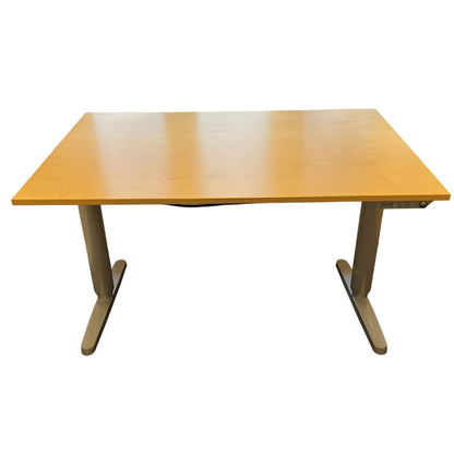 Solid hev/senk skrivebord m/ en elegant trefarget overflate og grått understell. Den elektriske hev/senk-funksjonen gjør det enkelt å tilpasse skrivebordet etter dine behov for en ergonomisk arbeidsplass.