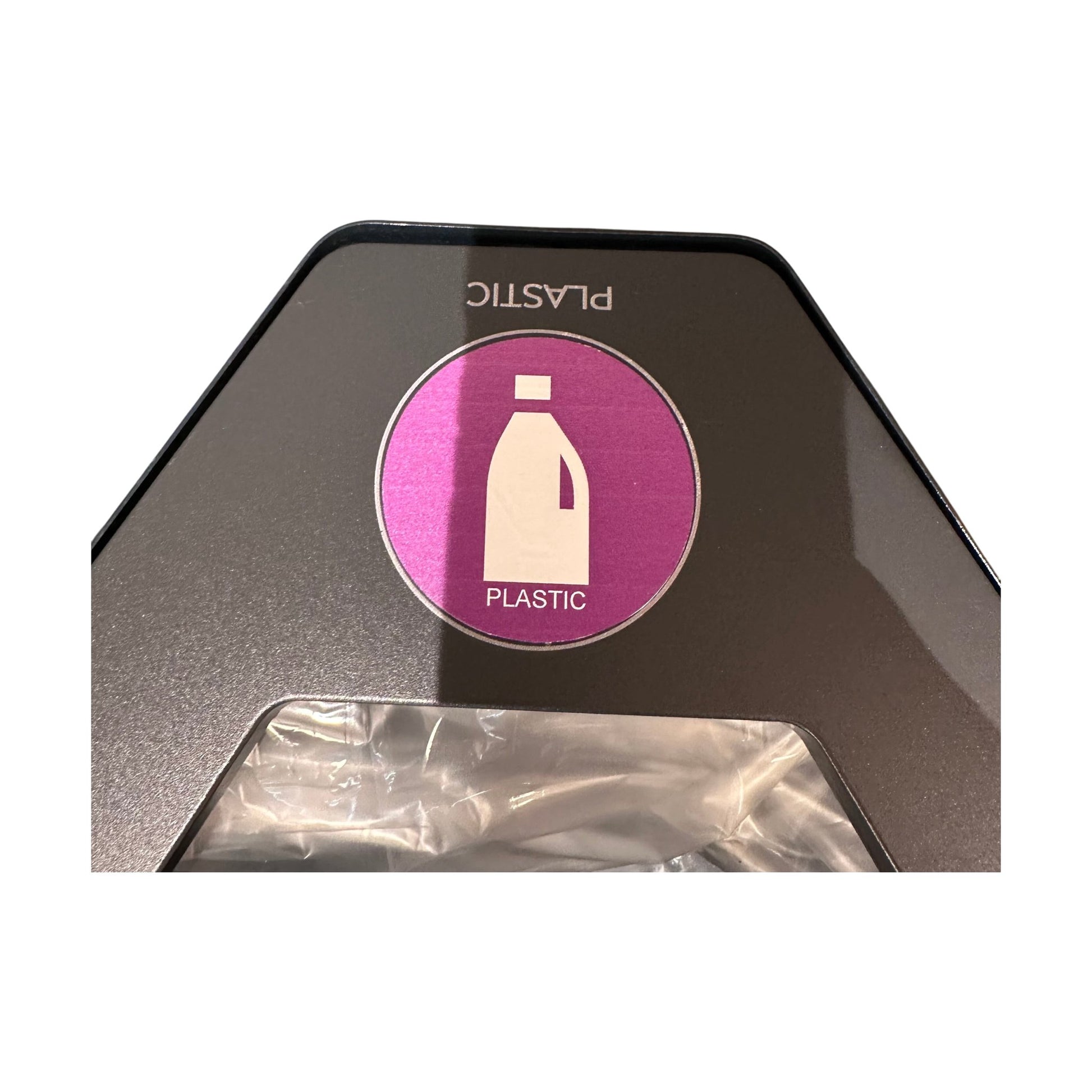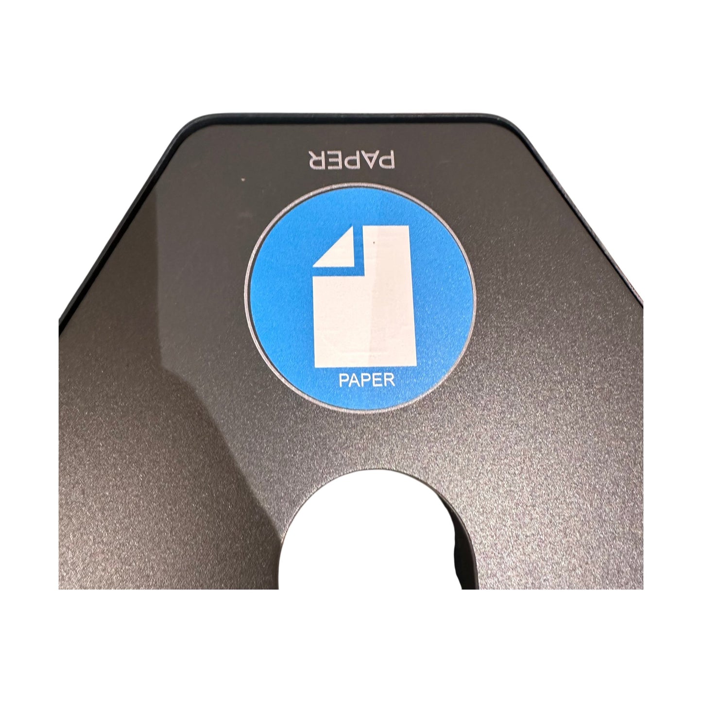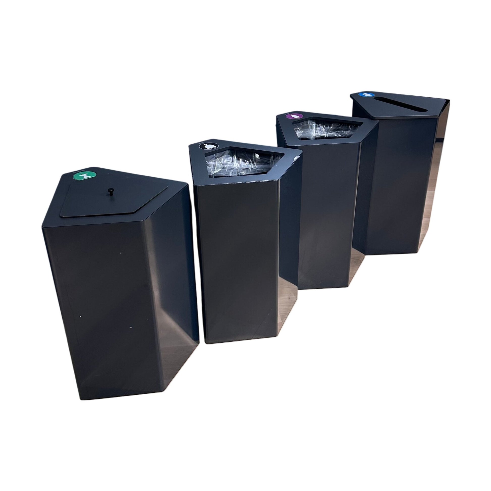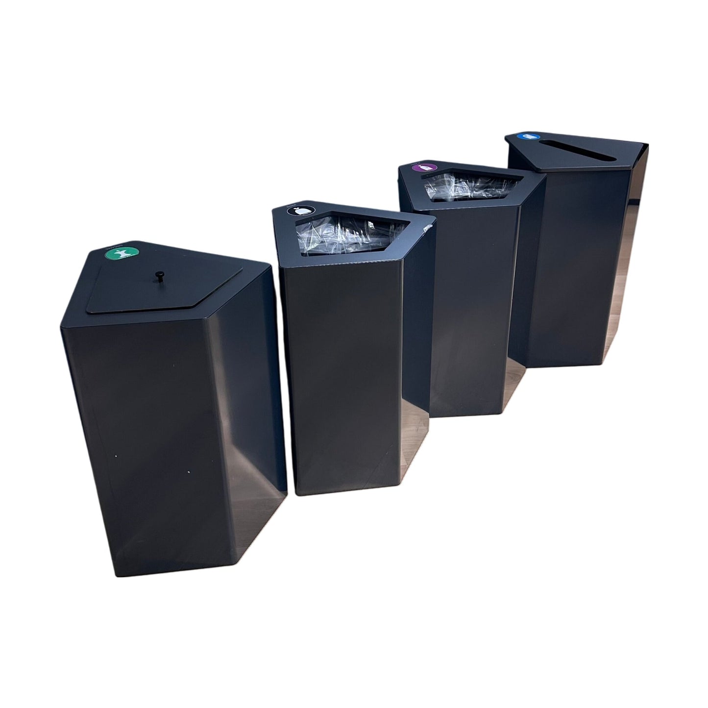 Trece kit avfallsbeholder er en moderne og stilren løsning for avfallshåndtering på kontoret. Den grå fargen gir et elegant uttrykk, og det unike designet med skrå tak og ulike åpninger gjør det enkelt å sortere avfallet effektivt.