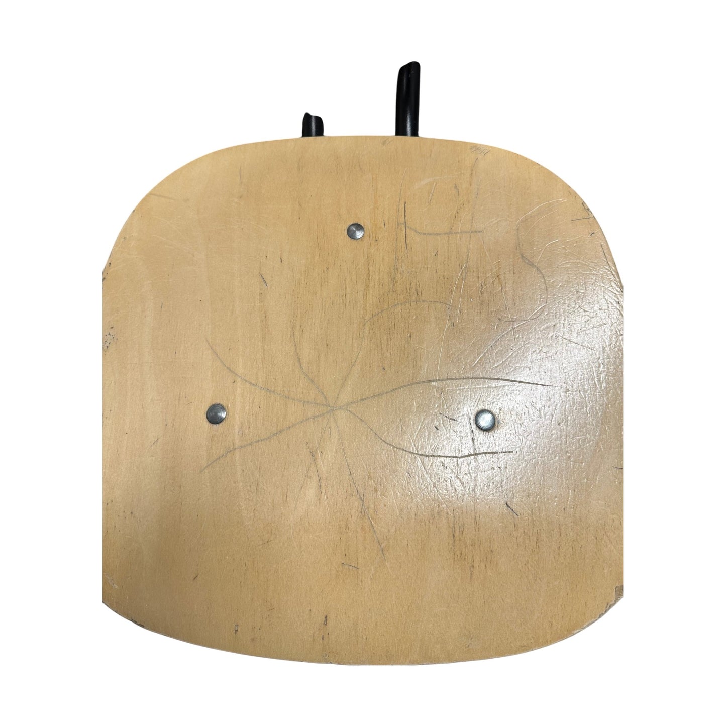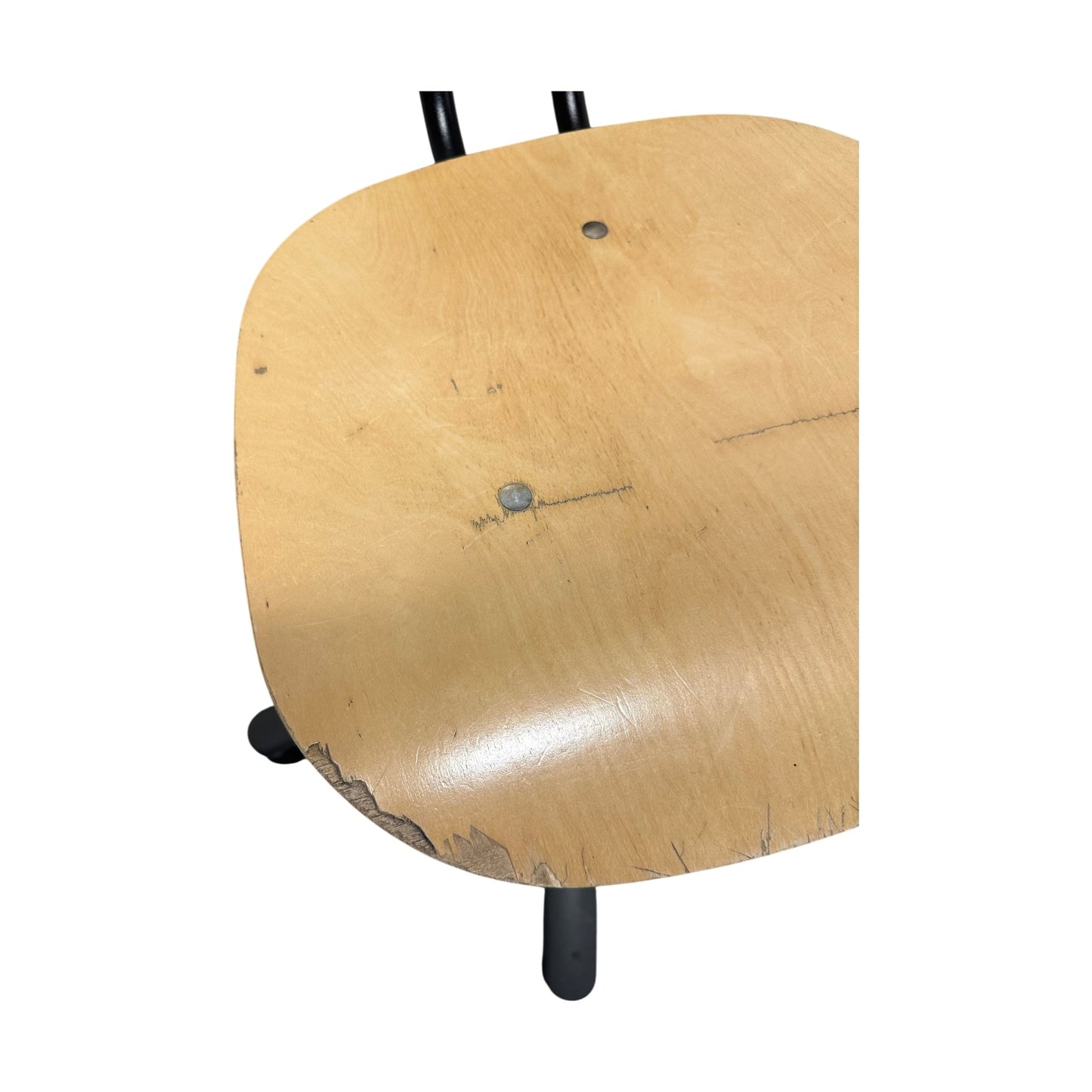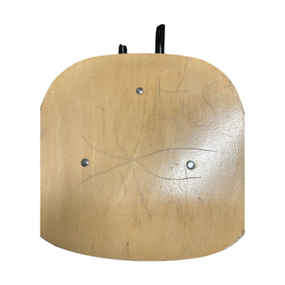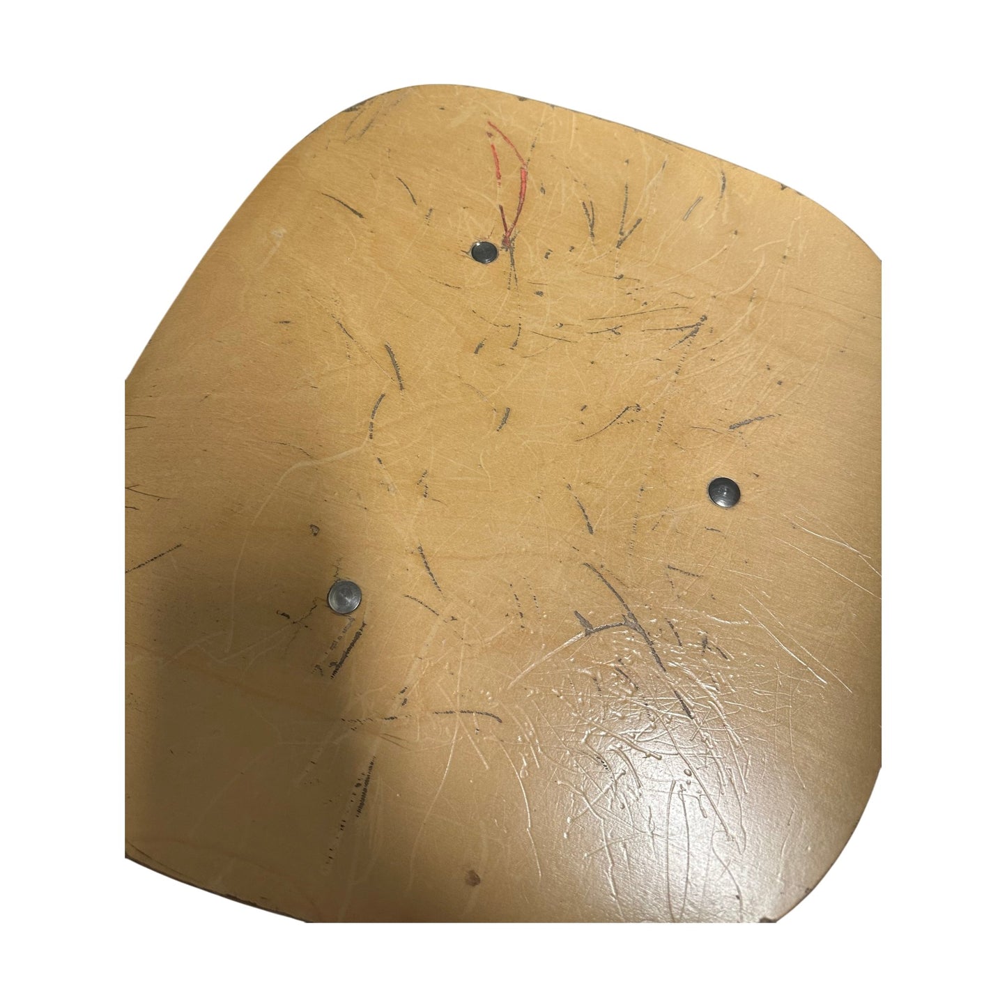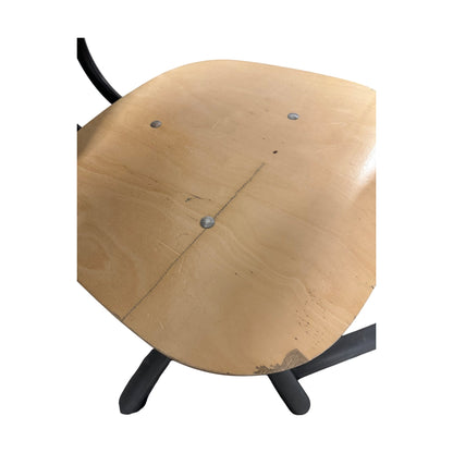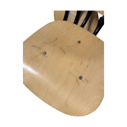 Stolen er godt brukt med synlige merker i treverket, samt tegnemerker på setet og ryggen. Bruksmerkene påvirker ikke funksjonaliteten, og stolen er fortsatt fullt brukbar.