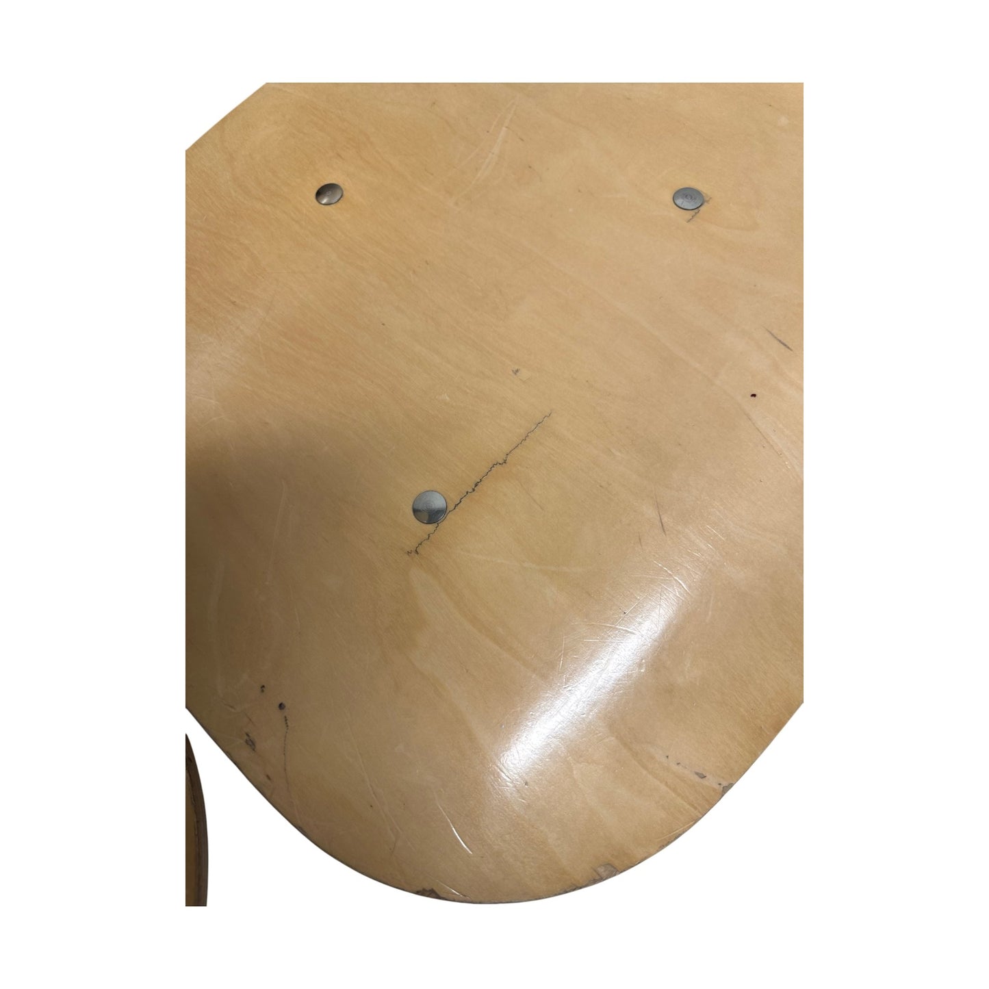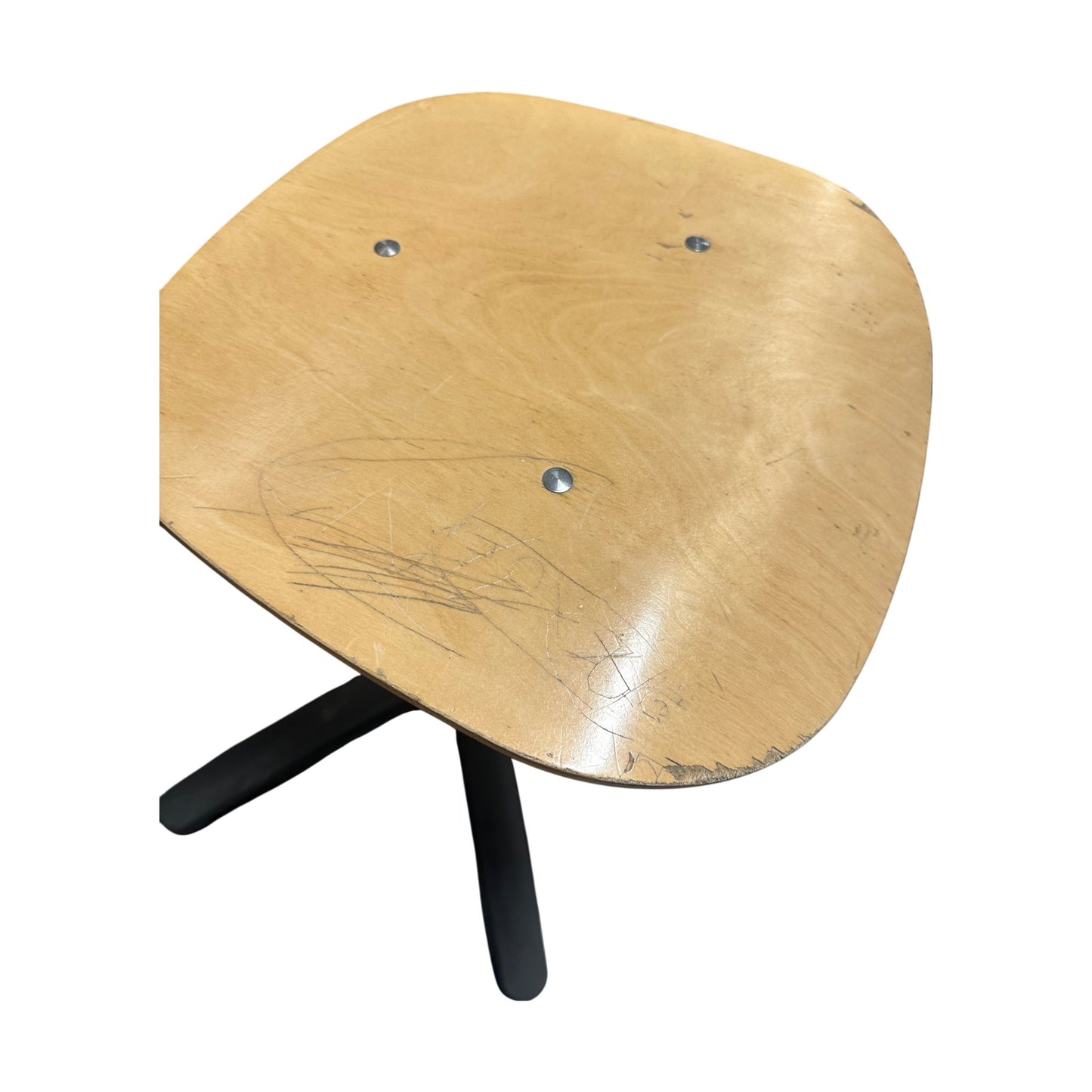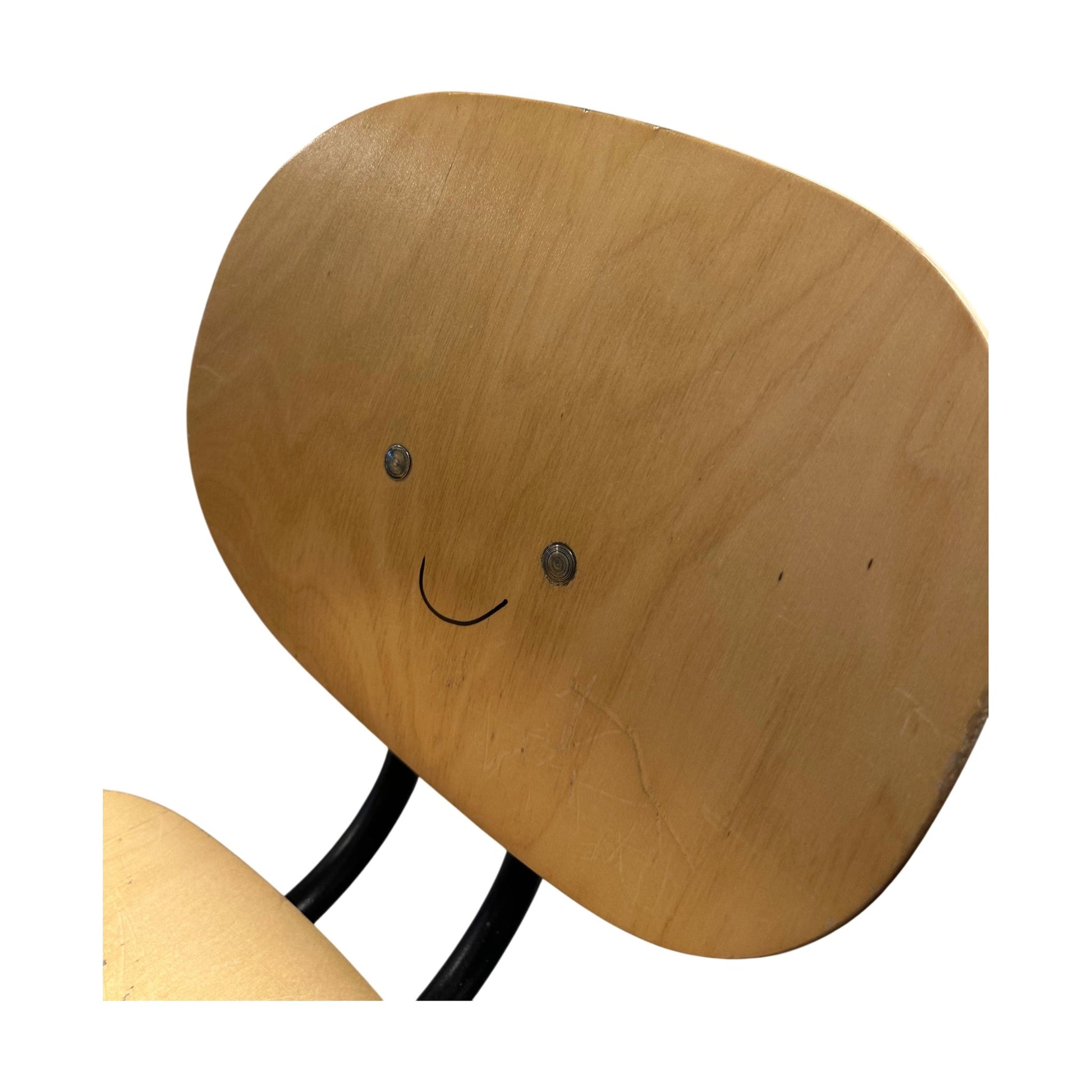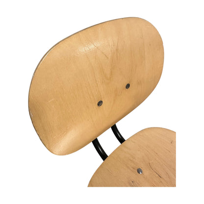 Stolen er godt brukt med synlige merker i treverket, samt tegnemerker på setet og ryggen. Bruksmerkene påvirker ikke funksjonaliteten, og stolen er fortsatt fullt brukbar.