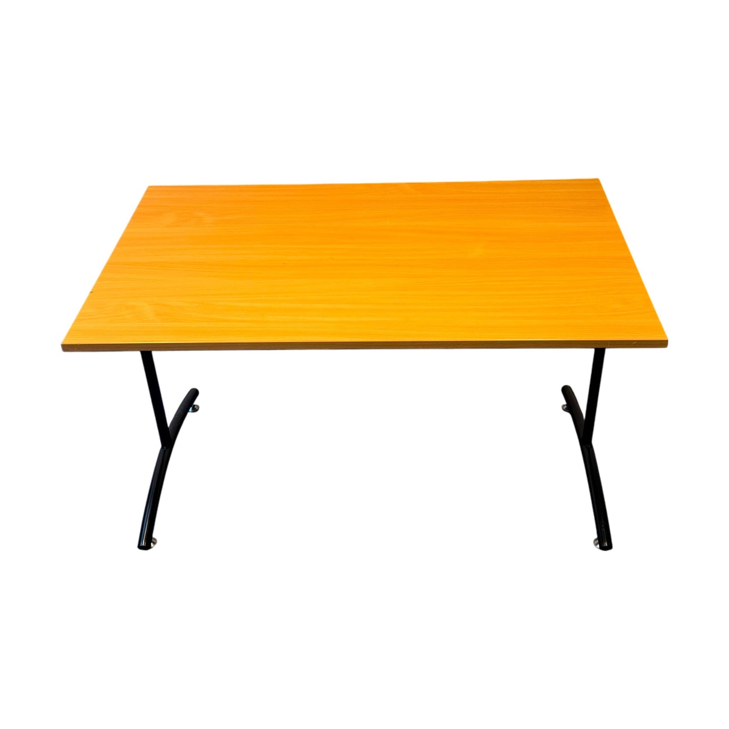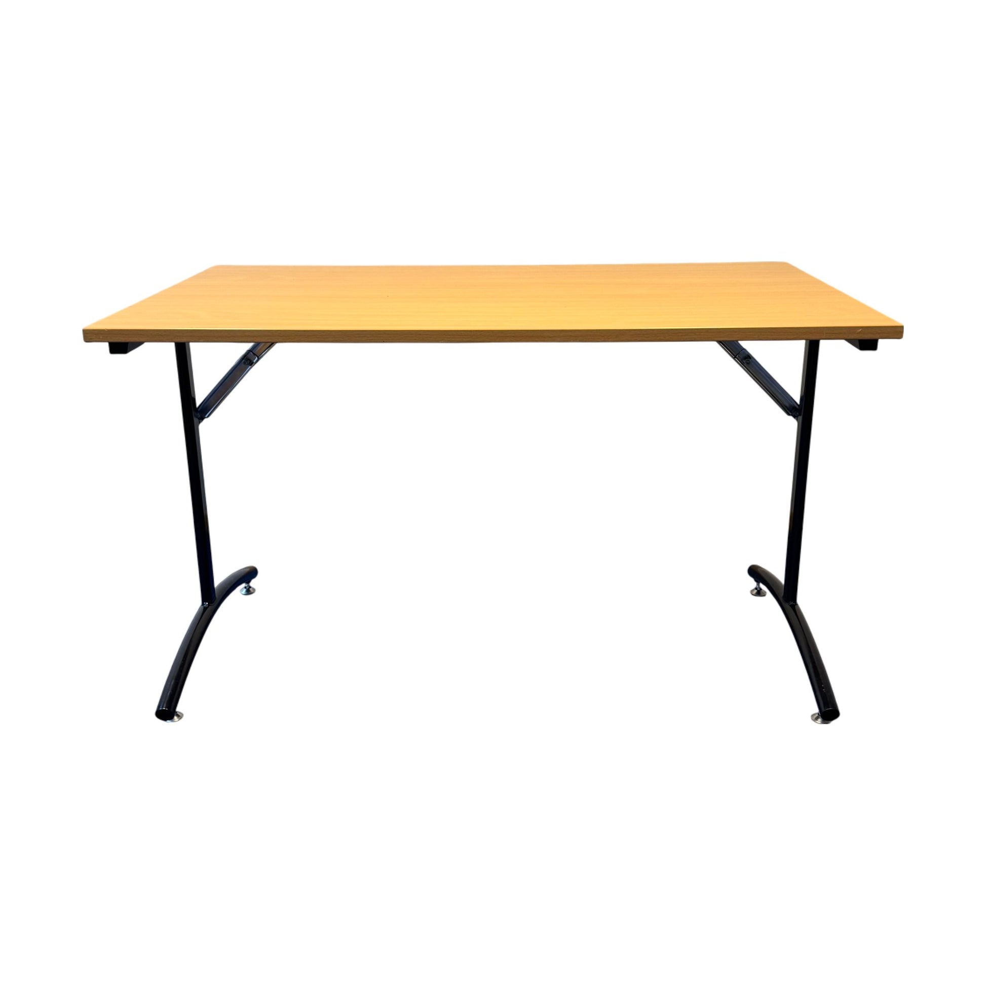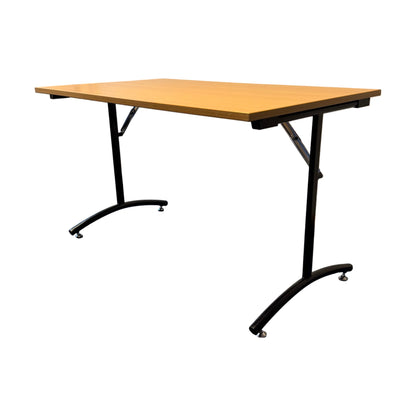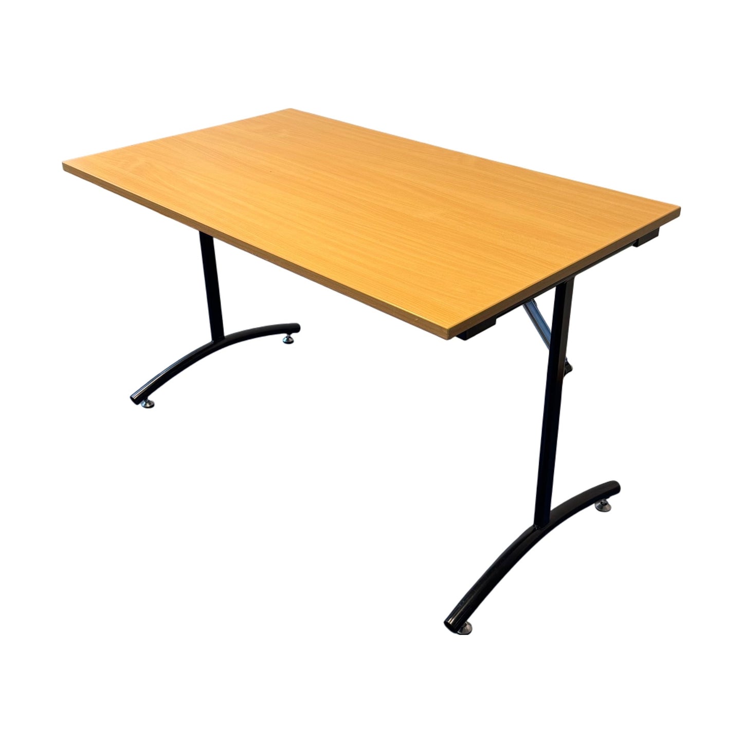 Trefarget klappbord med en praktisk størrelse på 120 cm. Dette bordet er ideelt for kontoret, ettersom det gir fleksibilitet og kan enkelt foldes sammen for oppbevaring når det ikke er i bruk. Designet gir et stilrent uttrykk, samtidig som det er robust nok til daglig bruk.