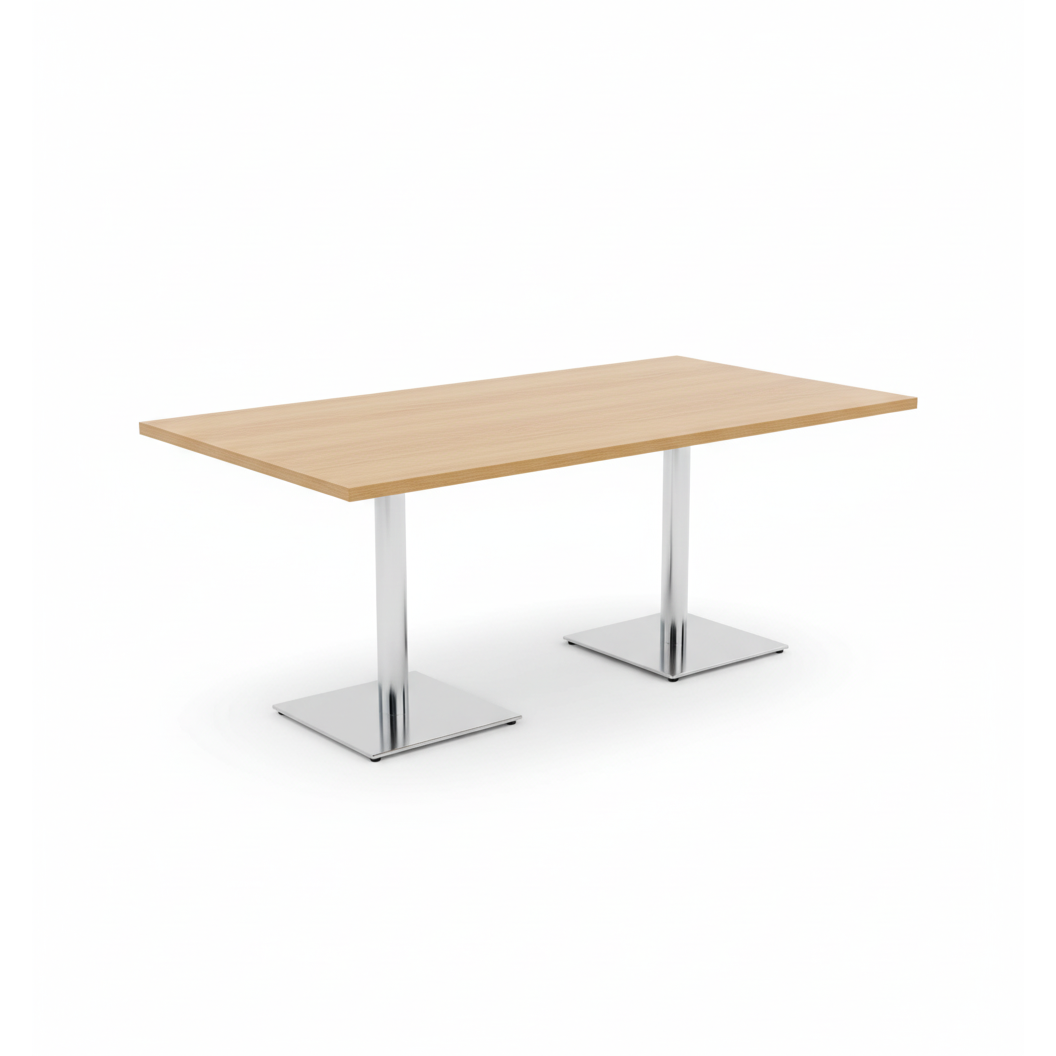 Solid møtebord med en slitesterk bordplate i trefarget laminat og et stilrent understell i kromert stål. Bordet gir et moderne og profesjonelt preg, og egner seg godt i møterom, kontorer og andre arbeidsmiljøer.