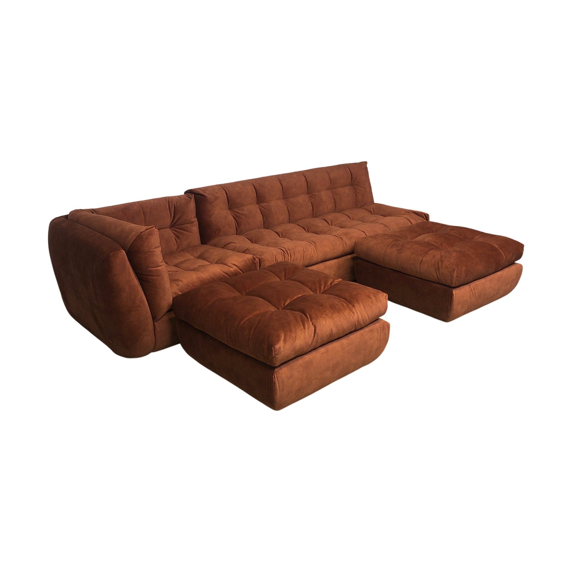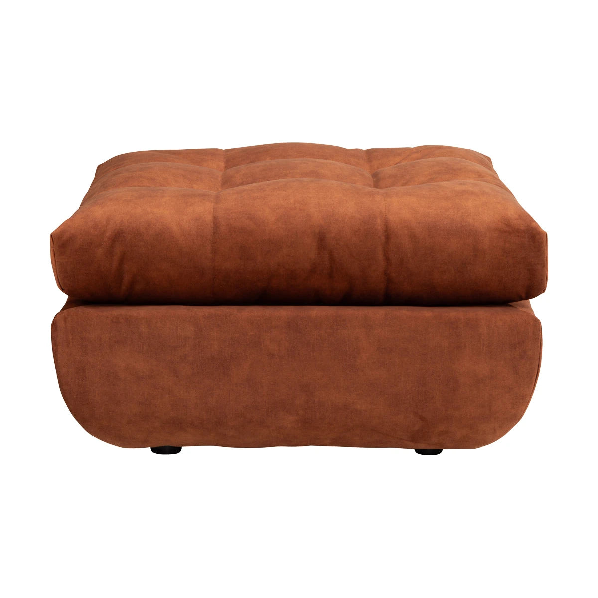 Troels sofagruppe bestående av en sofadel, to puffer og en hjørnedel. Alle delene er frittstående og kan plasseres fritt. Denne sofagruppen har et moderne design og gir god plass til sosiale sammenkomster. Trekket i rødbrun velour skaper en lun atmosfære i stuen.