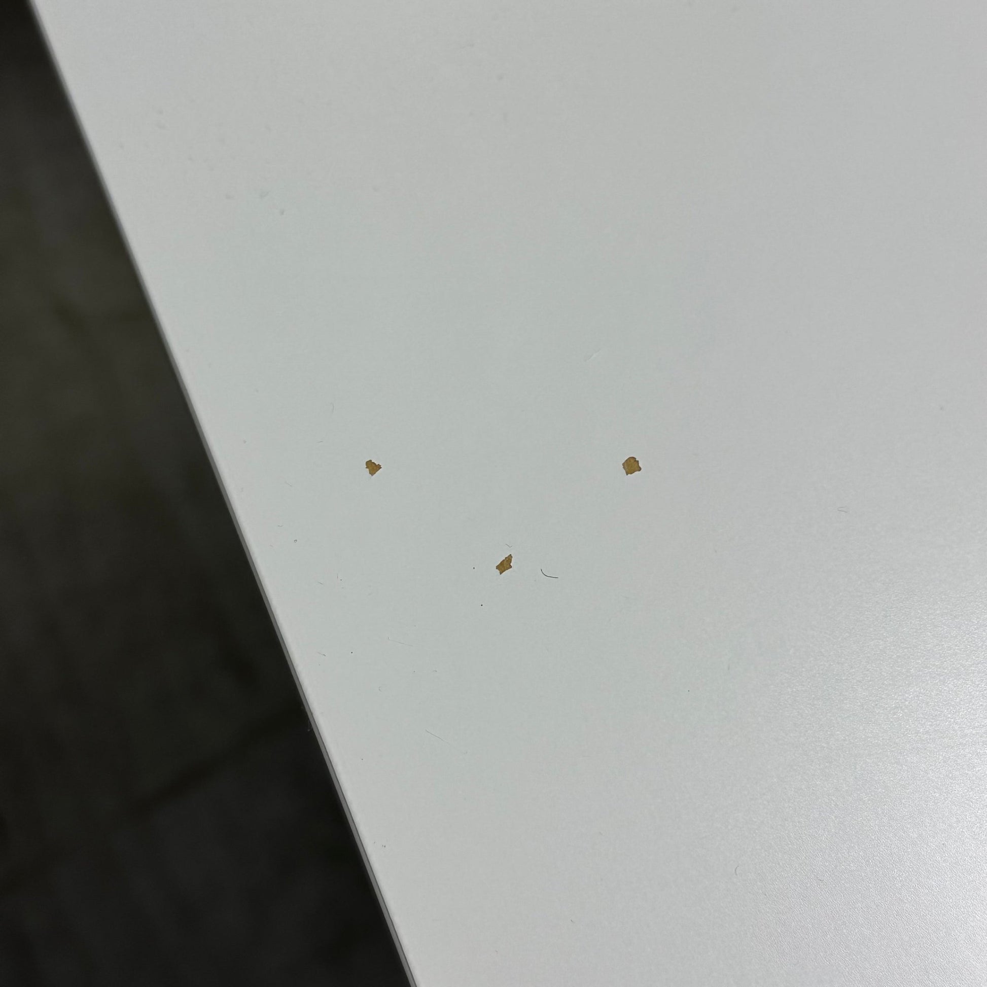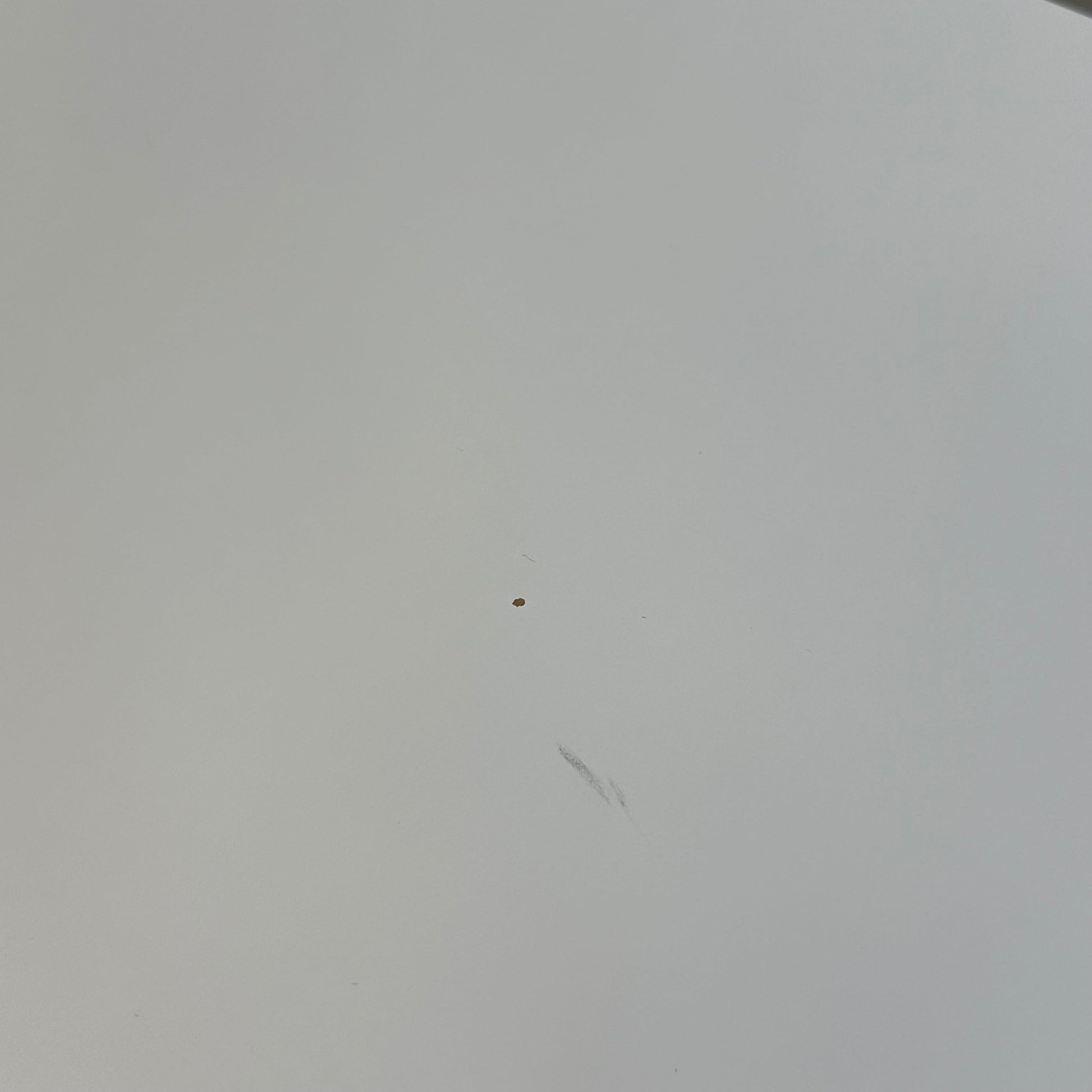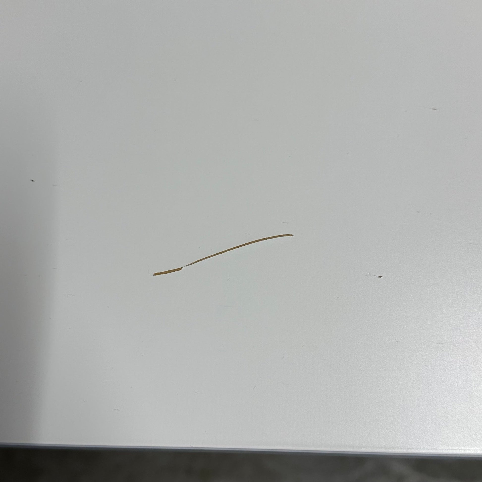 Skrivebordet er i godt brukt tilstand med synlige hakk og småmerker på bordplaten, samt flere skrammer på bena. Til tross for brukstegnene er skrivebordet funksjonelt og passer godt til forskjellige kontoroppsett.