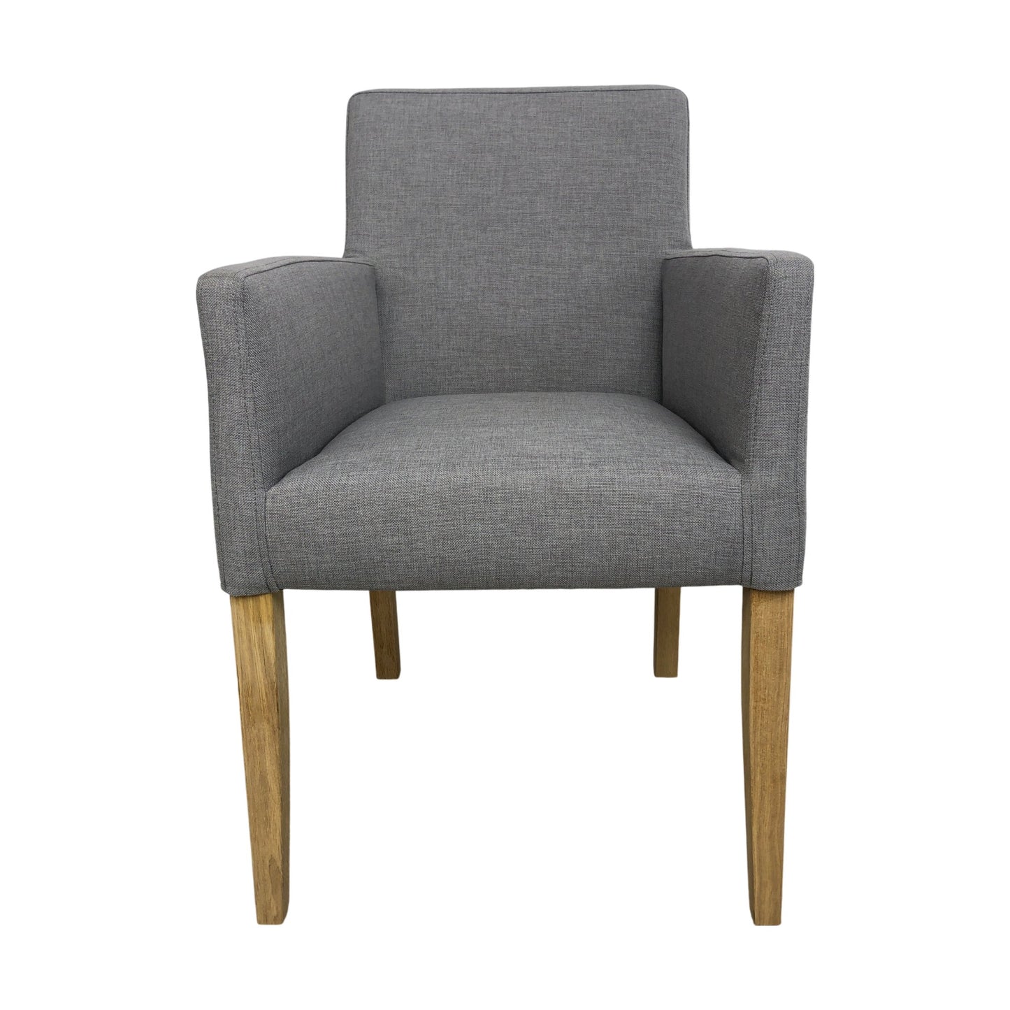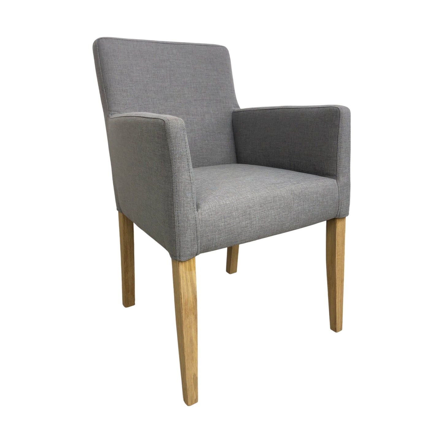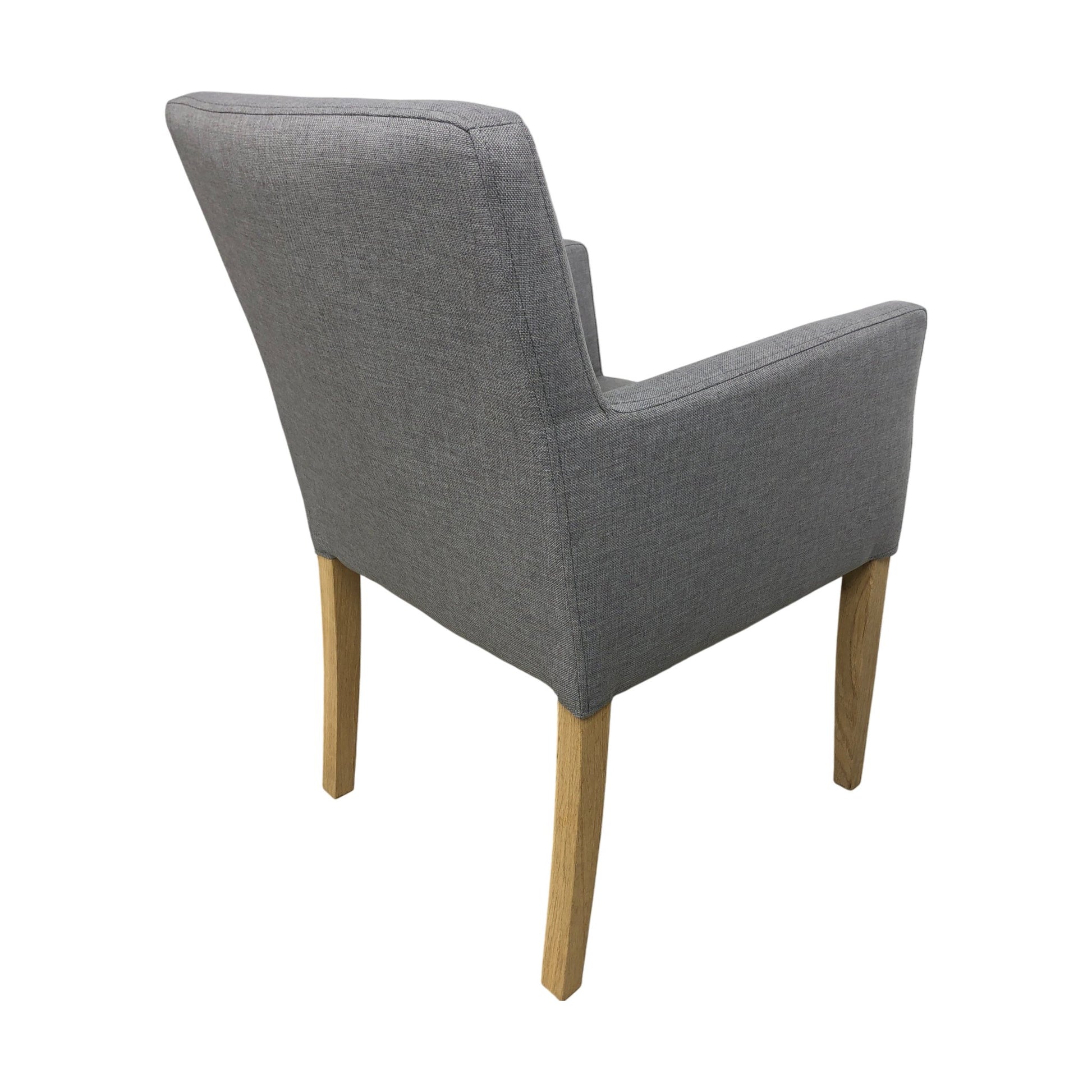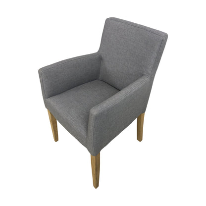 Spisestol med armlener i grått stoff med lyse treben. Ubrukt vare fra Home&Cottage.