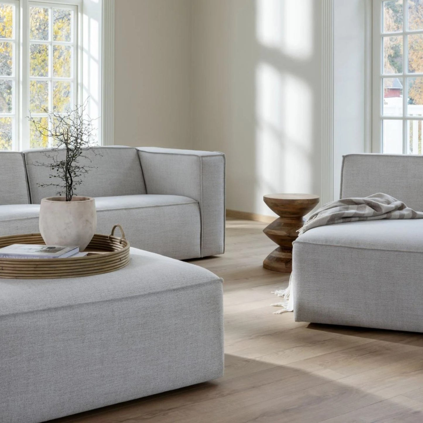 Den robuste utformingen med skjulte ben, tilfører komfort i stilen, samtidig som sømmene strammer opp og gir sofamodulene et moderne preg. Modulsofaen er solid og består av materialer som gir god komfort og holder godt på fasongen. Den er bygget på en ramme av heltre furu og kryssfiner, som gir en stødig og holdbar kvalitet. Leveres med klips som holder modulene sammen.