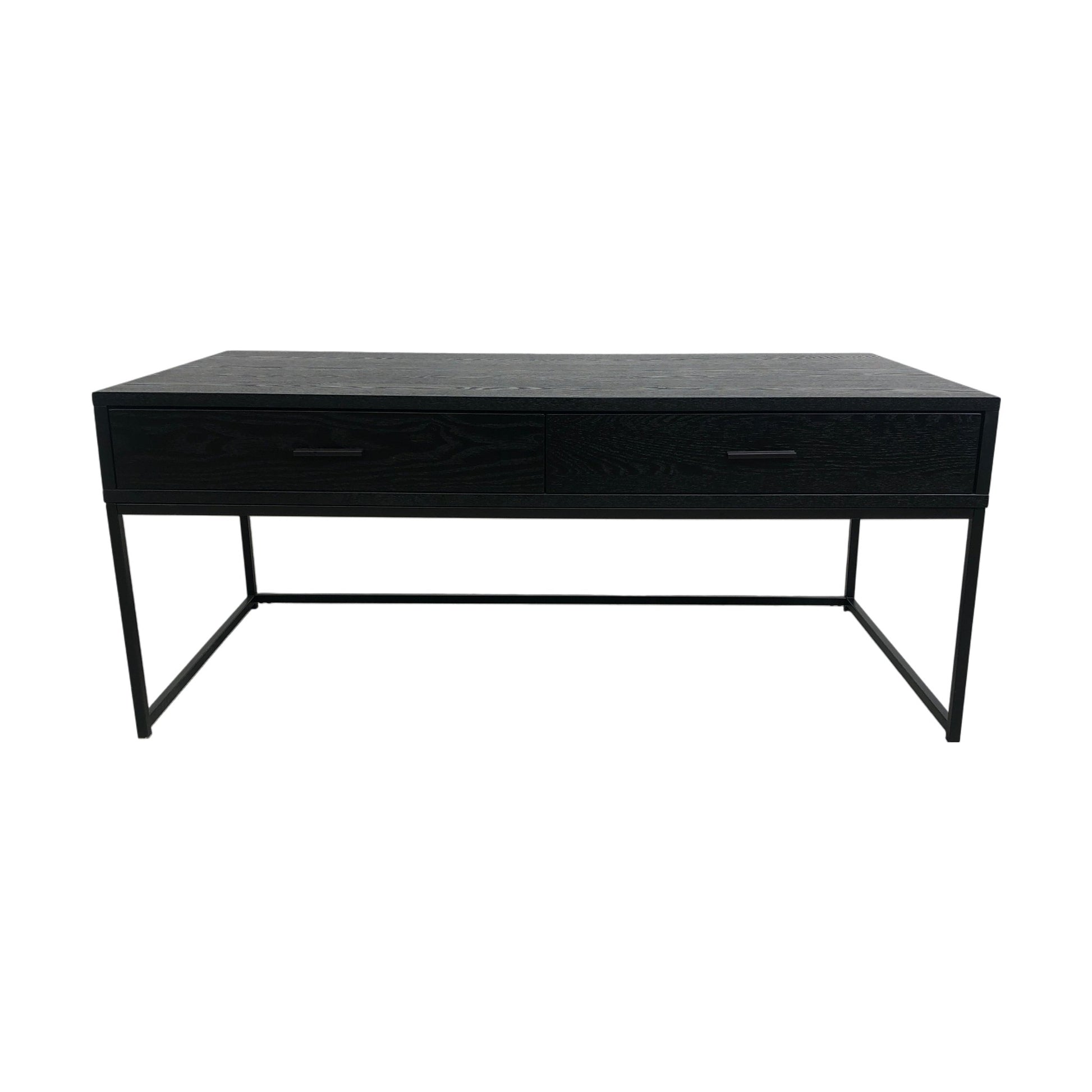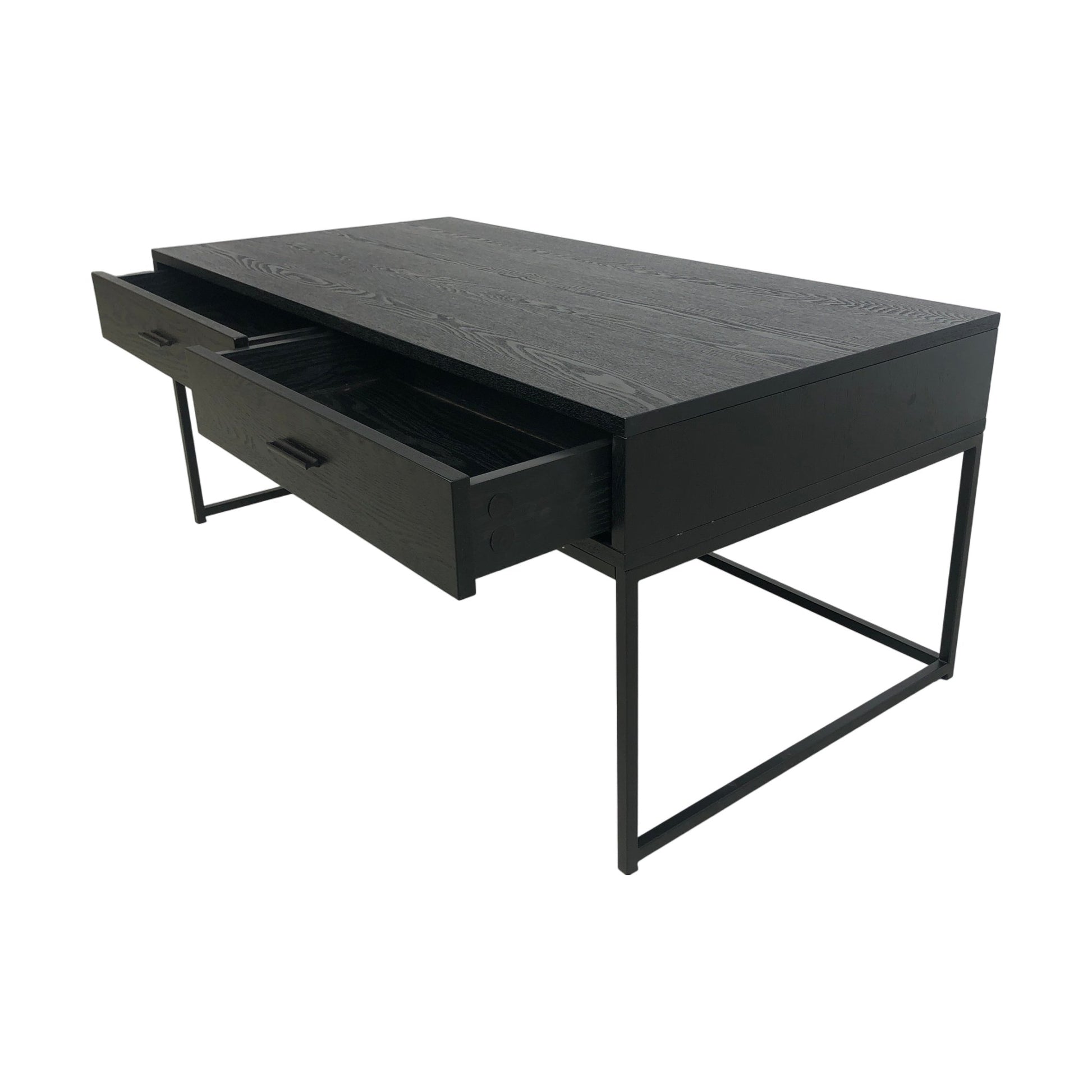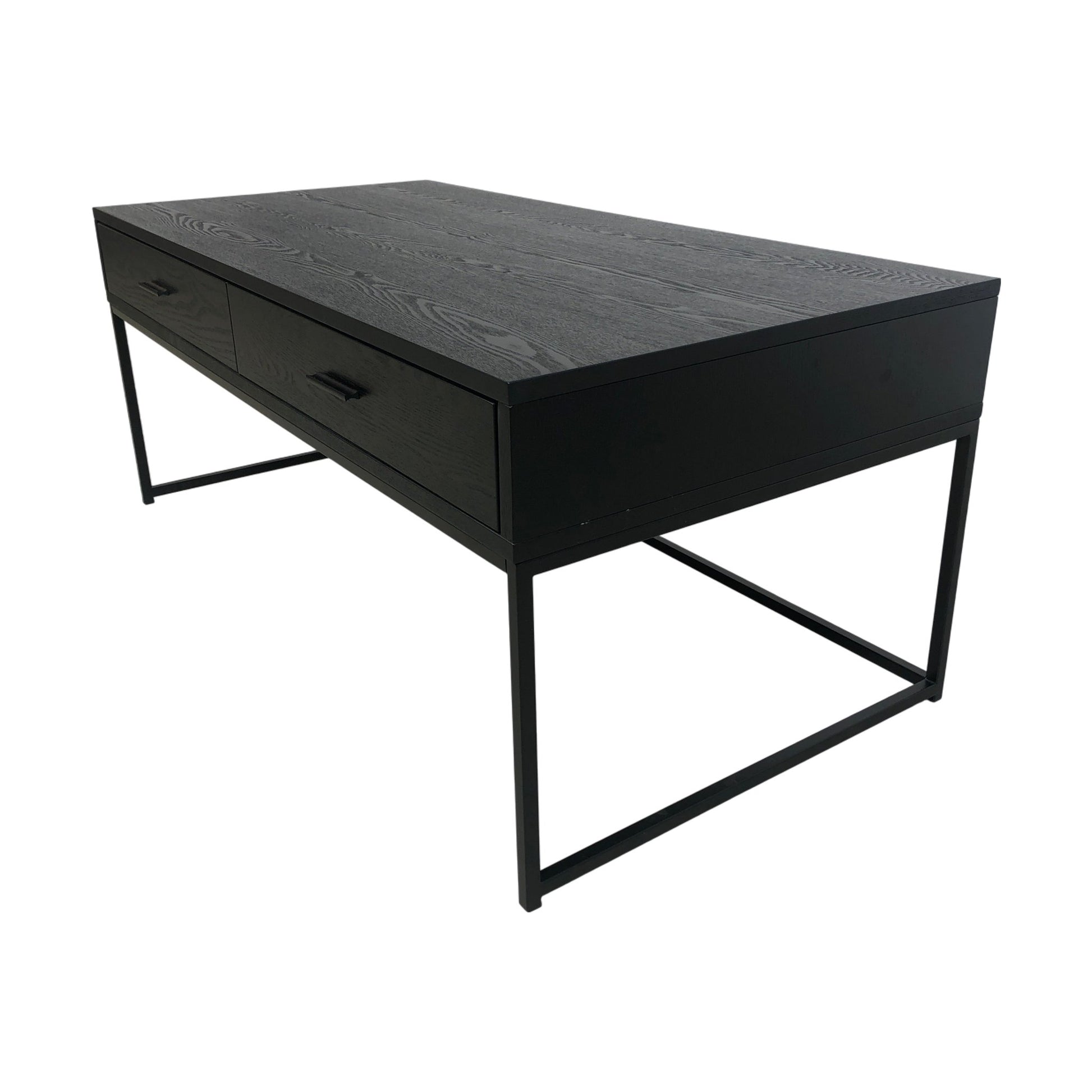 Stilrent sofabord fra A-Møbler i Udine-serien, laget av MDF med sortfiner og solid metallunderstell. Bordet har to praktiske skuffer med soft-close, og tilbyr en praktisk løsning som kombinerer funksjonalitet med moderne design.
