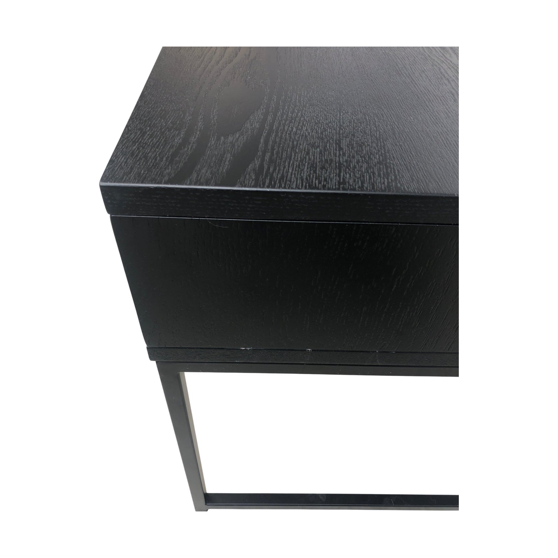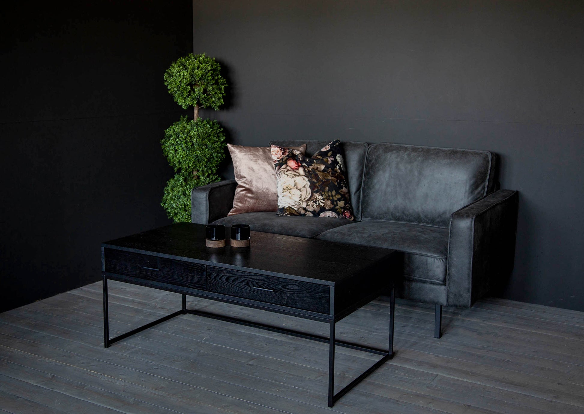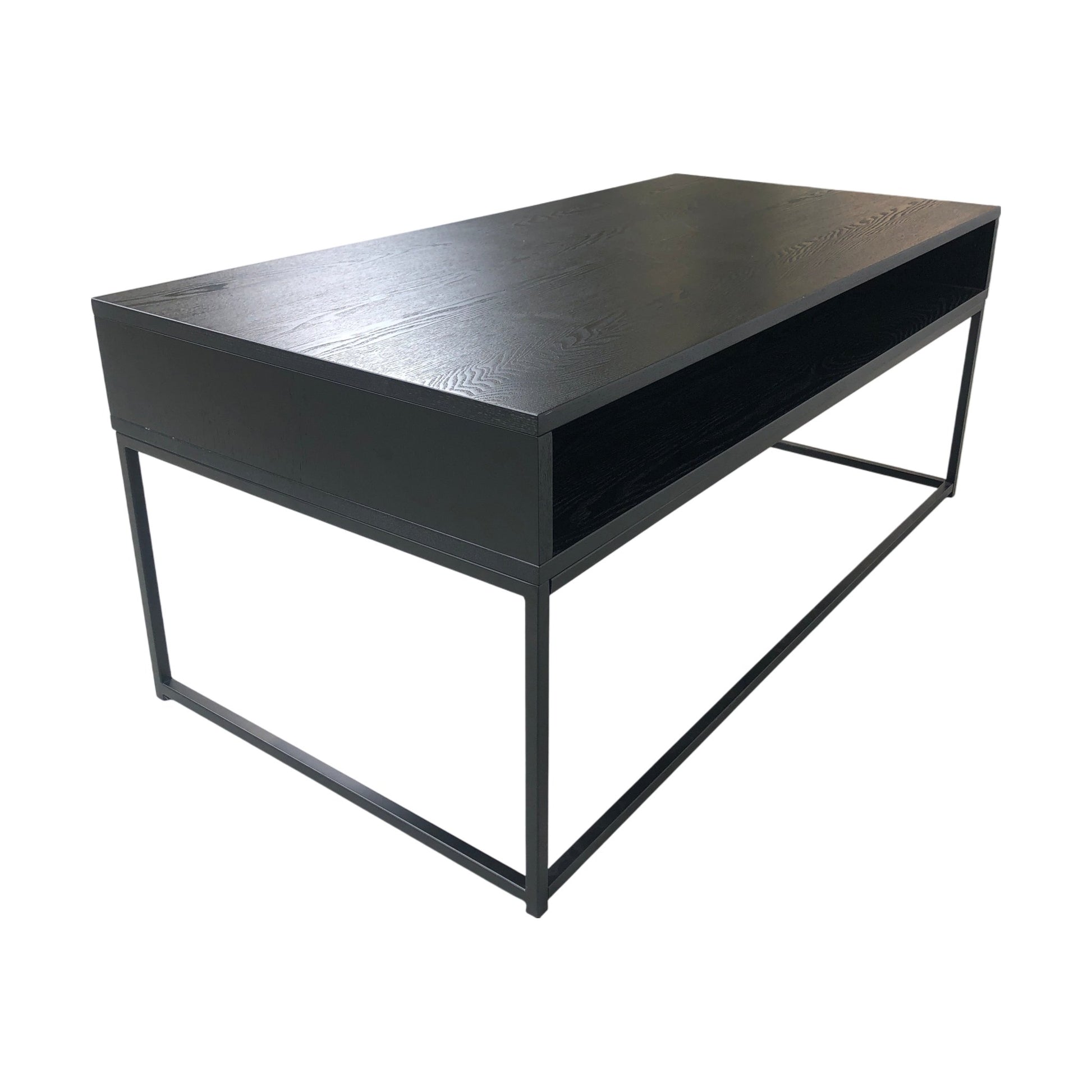 Stilrent sofabord fra A-Møbler i Udine-serien, laget av MDF med sortfiner og solid metallunderstell. Bordet har to praktiske skuffer med soft-close, og tilbyr en praktisk løsning som kombinerer funksjonalitet med moderne design.