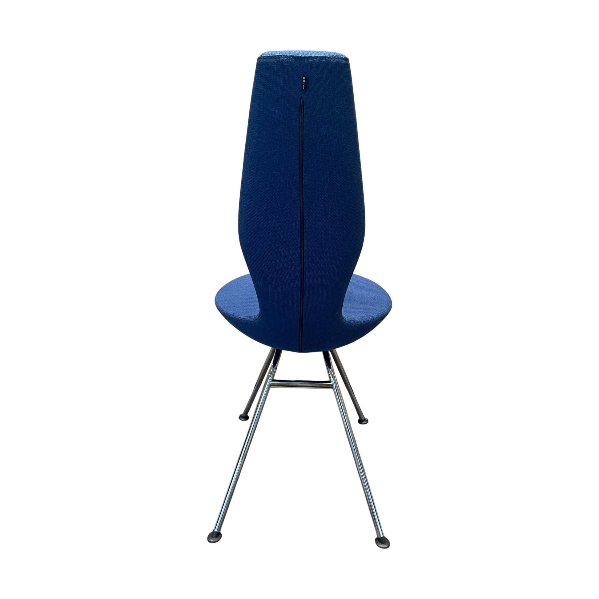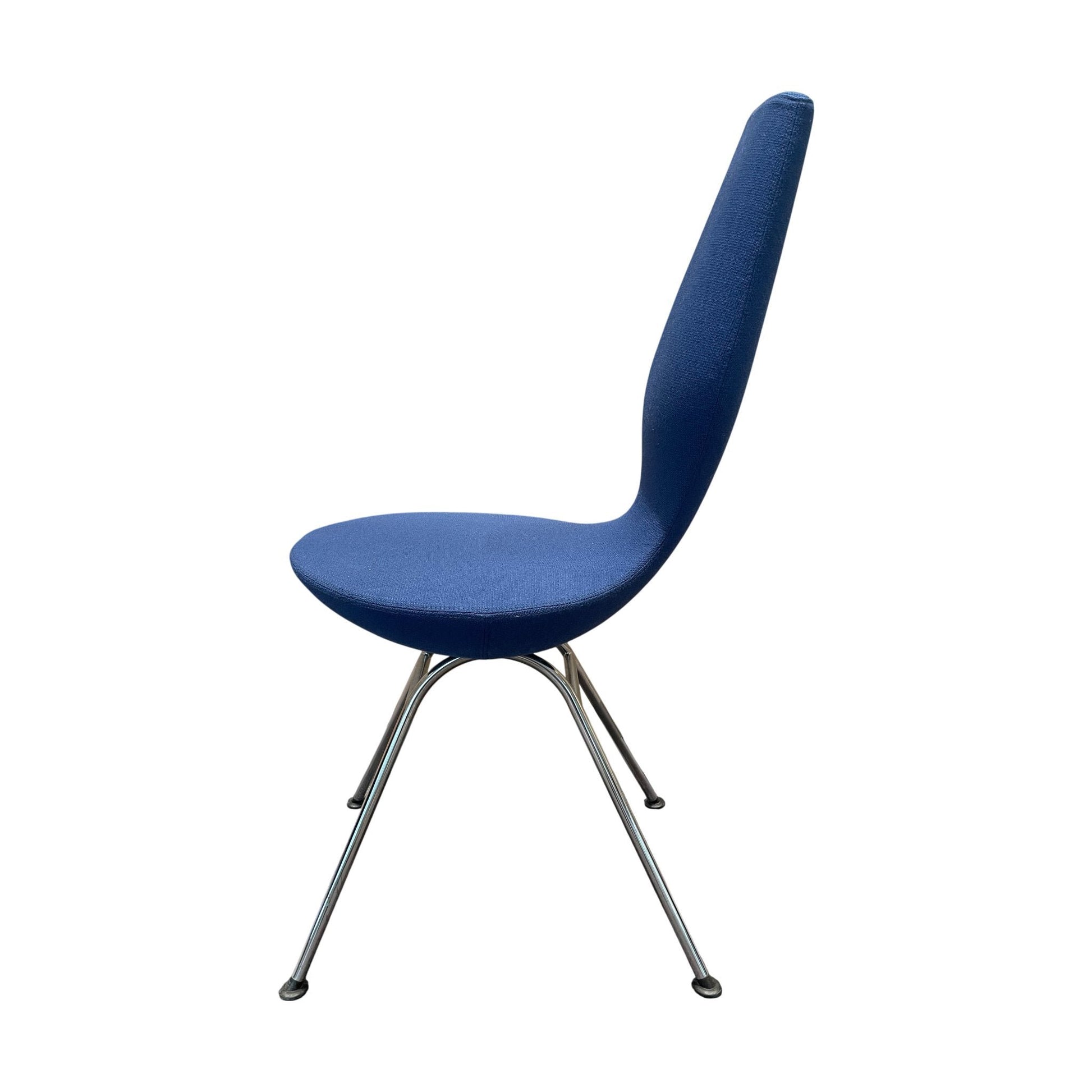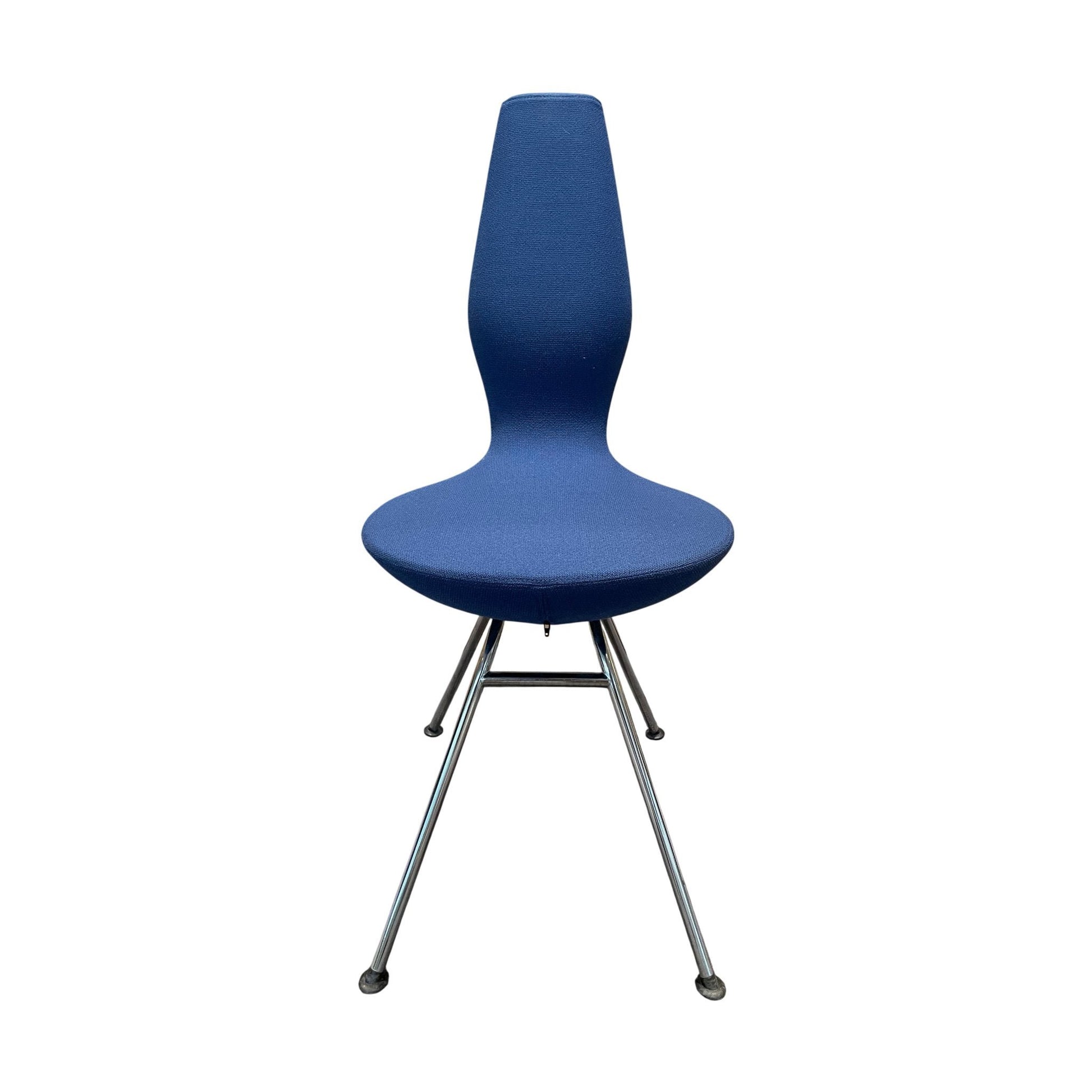 Moderne møteromsstol fra Stokke, designet av Olav Eldøy. Stolen har en elegant og stilren form med et komfortabelt sete trukket i slitesterkt blått stoff. Den karakteristiske designen gir et unikt preg, noe som gjør den ideell for både møterom og kontormiljøer. Stolen har en stabil base med fire ben som gir solid støtte, perfekt for lange møter.