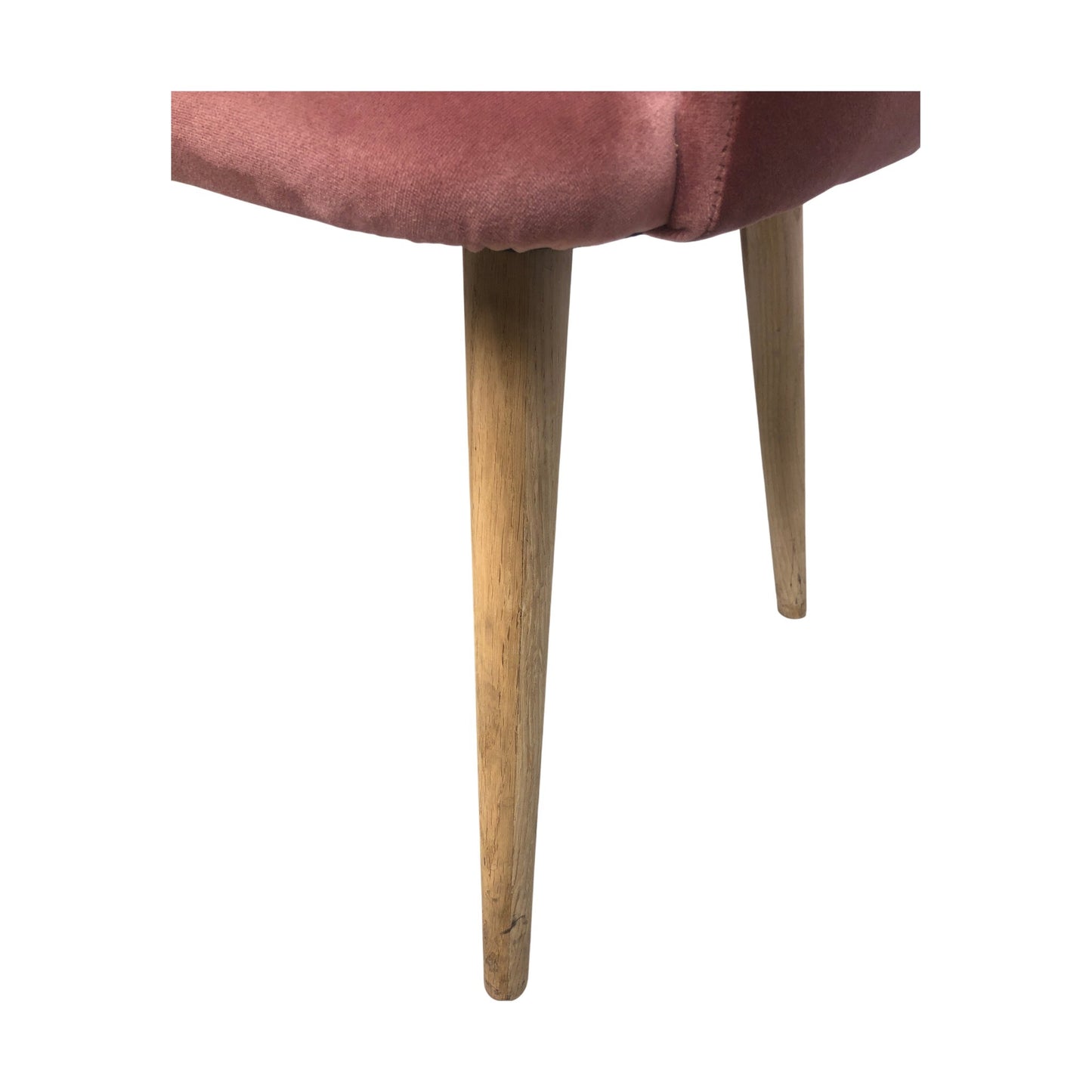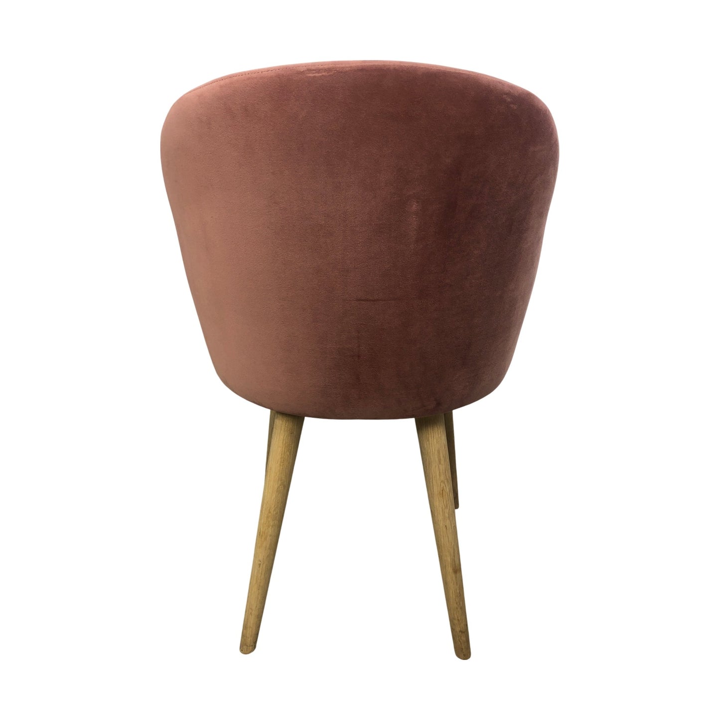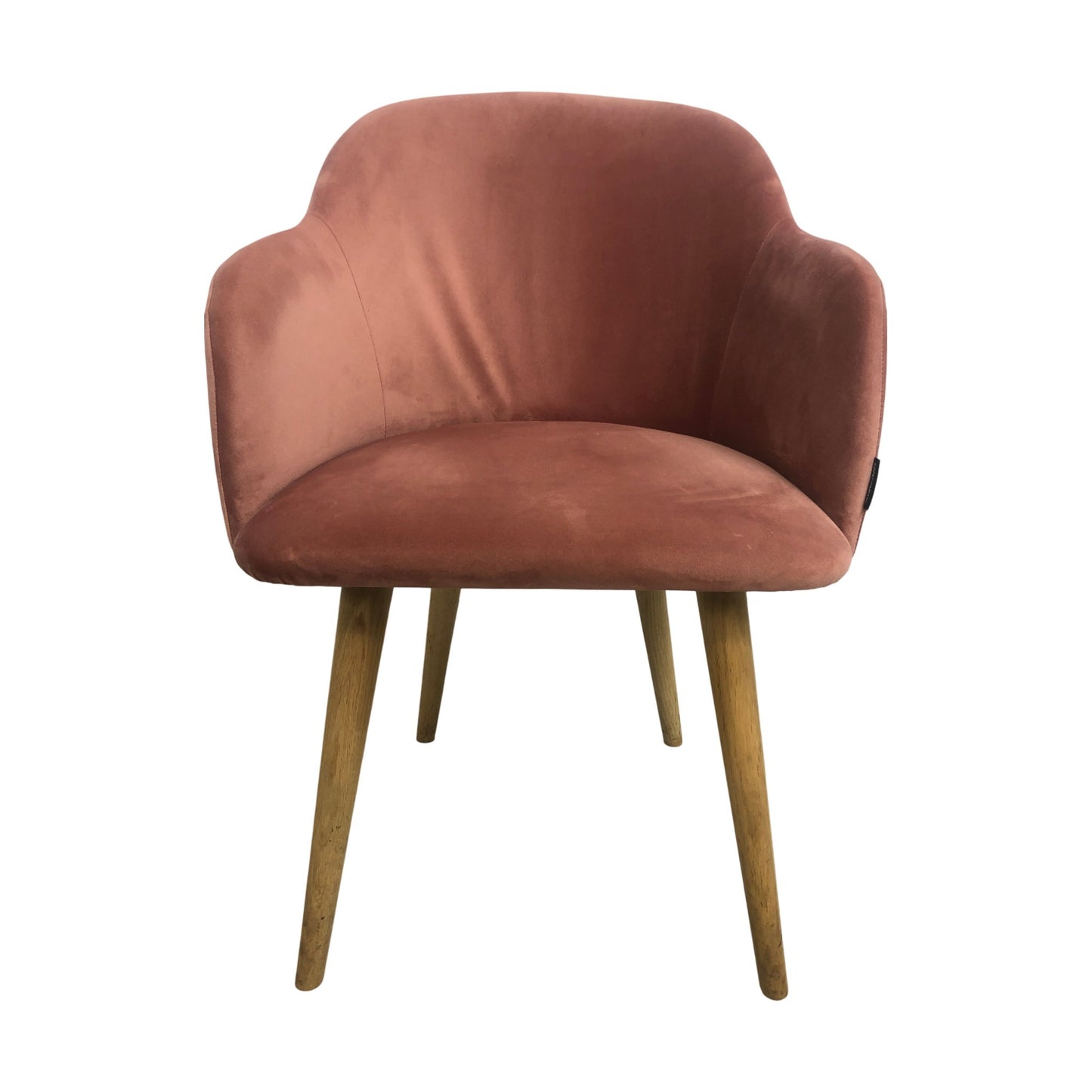 Stilig og moderne spisestol fra SOFACOMPANY, kledd i mykt rosa velurstoff. Den har en tidløs design med fine kurver og behagelige armlener, som gjør den perfekt til enhver spiseplass. Bene av lys, naturlig tre gir et flott kontrast til det dype, grønne stoffet og tilfører en varm atmosfære. Dette er en stol som kombinerer komfort med et elegant uttrykk.