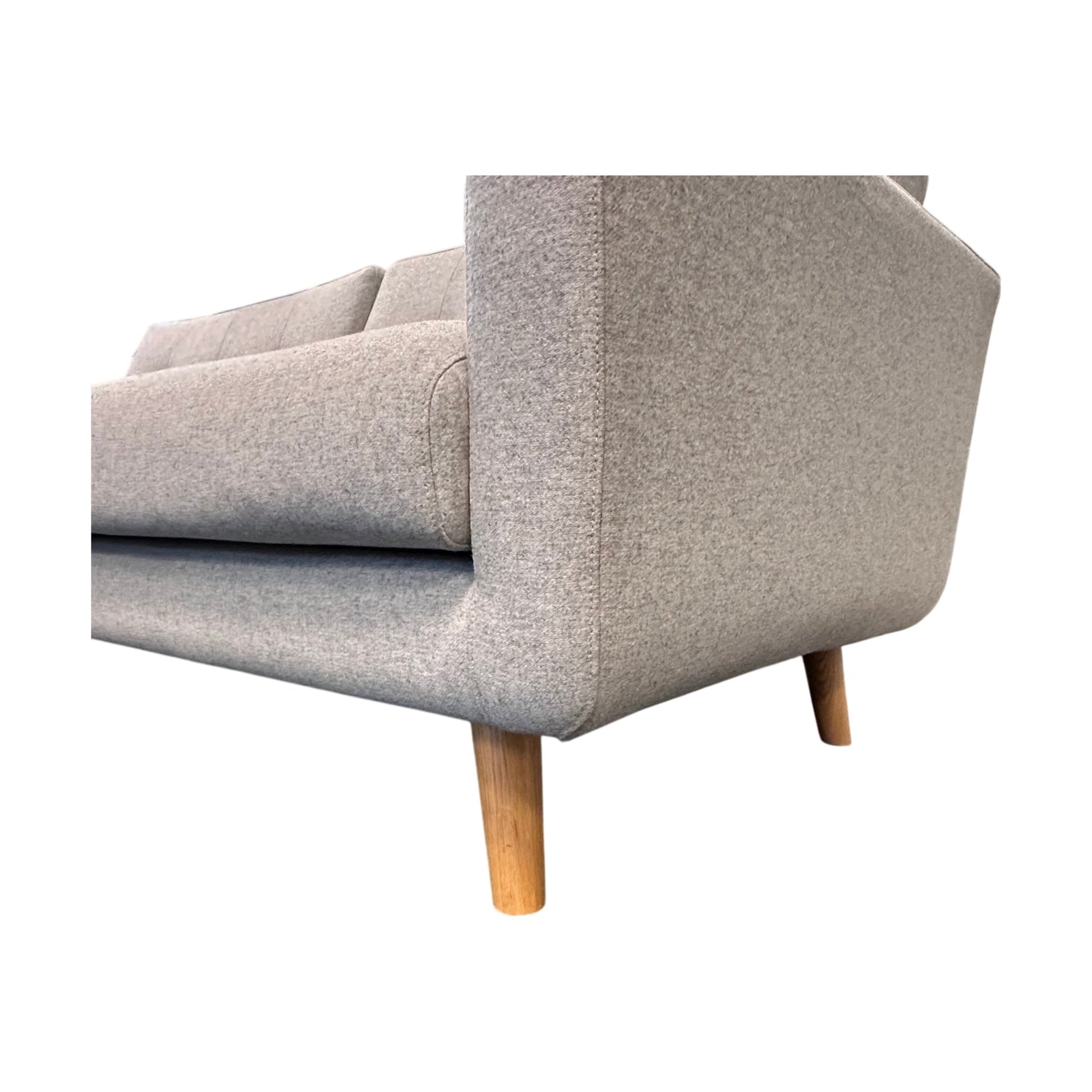 Vera er en stilfullt og klassisk 3-seter sofa som er inspirert av den enestående danske designtradisjonen fra 1950-tallet. Med sine massive, vinklede treben og skrånende armlener, gir den et elegant uttrykk. Sofaens myke, grå ullstoff står i kontrast til de karakteristiske knappene i ryggputene, som tilfører et retro preg. Den romslige sitteflaten og de løse putene gjør den perfekt for komfortable stunder i stuen.