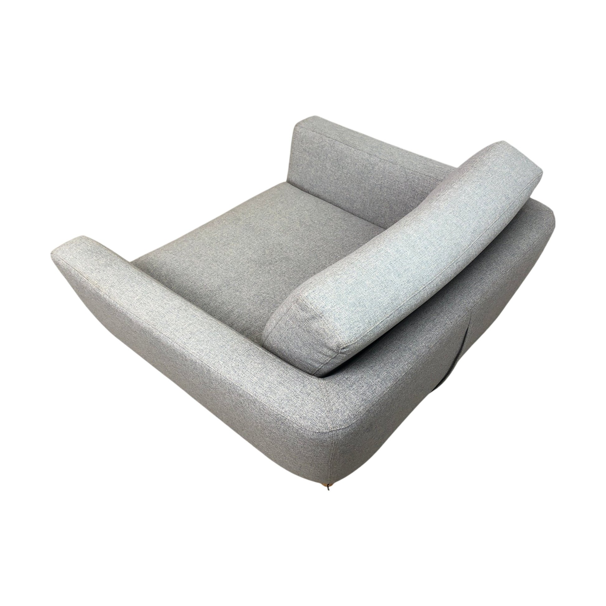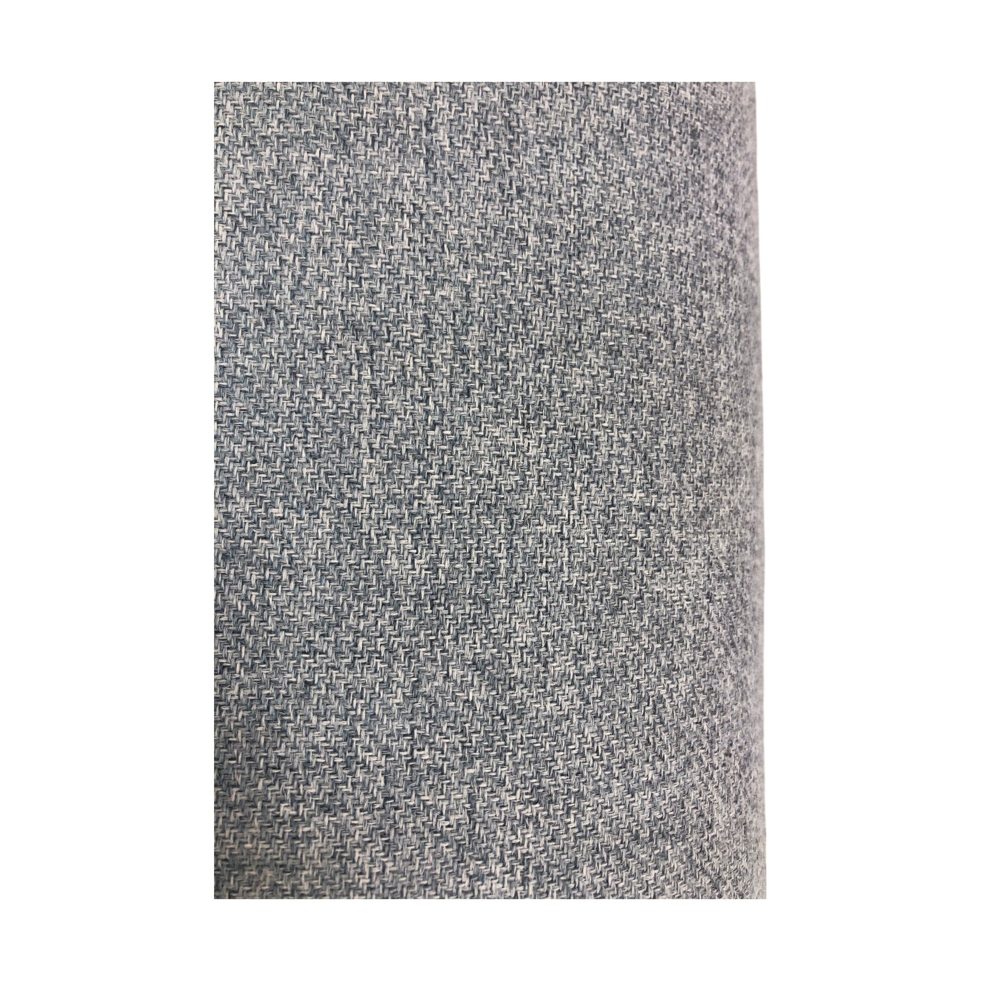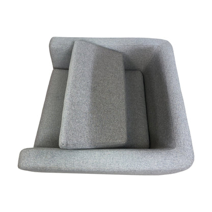 Stolen er i god tilstand, men den en originale lyse gråfargen har fått et lysere og blålig preg. Det er noen synlige bruksmerker på utsiden av det ene armlenet. Til tross for dette er stolen i god stand og tilbyr fast og behagelig sitting, noe som gjør den til et godt valg for både avslapning og arbeid.