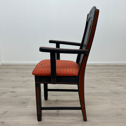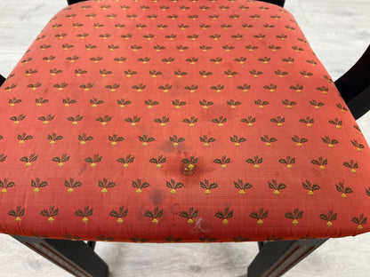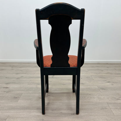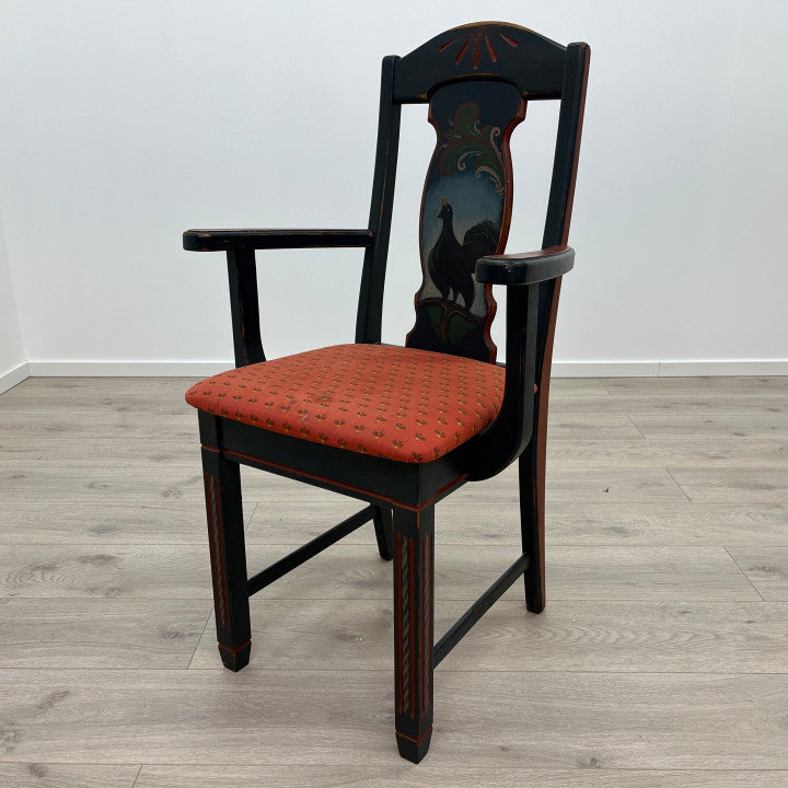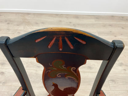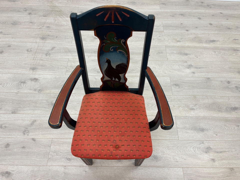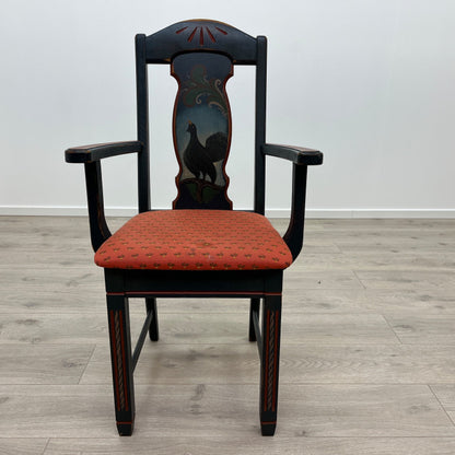 Vintage spisestol av mørk tre med polstret sete og fuglemotiv