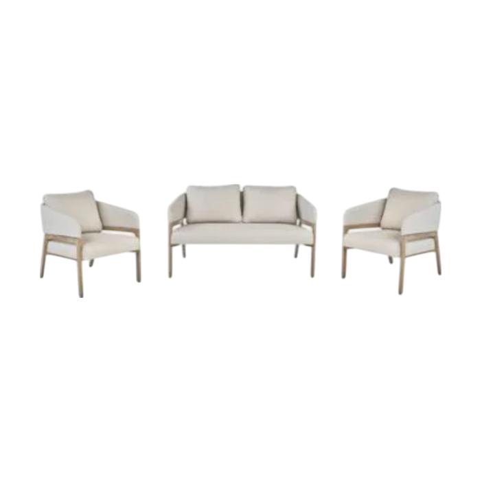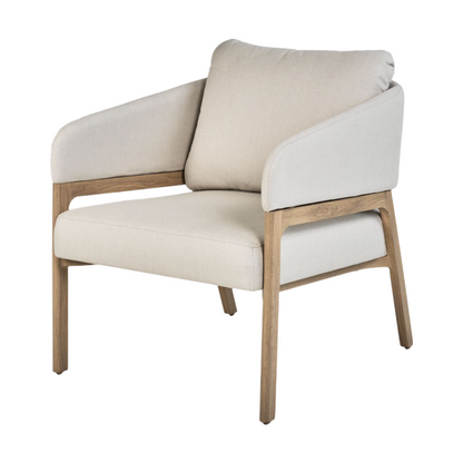 Elegante Viola loungestoler fra Kid, perfekt for både innendørs og utendørs bruk. Stolen har en moderne stil med en kombinasjon av behagelig beige tekstil og en solid, naturfarget trestruktur. Den gir en avslappende sitteopplevelse og tilfører et stilrent preg til ethvert rom.