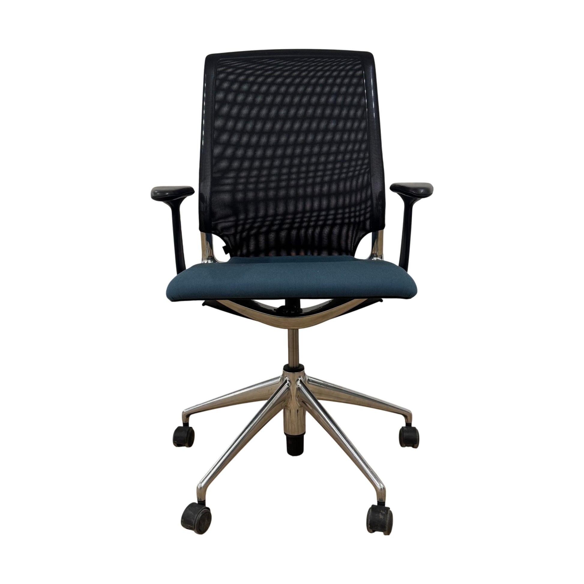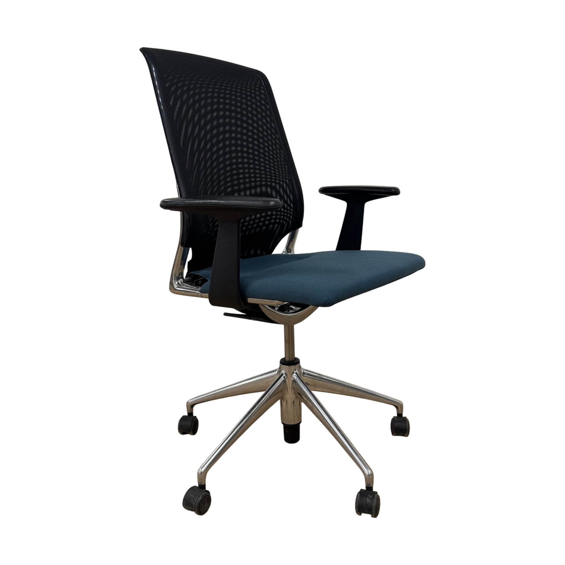 Komfortabel kontorstol fra Vitra med en moderne og stilren design. Stolen har et blått sete som gir et friskt preg, kombinert med en svart, nettingrygg for god ventilasjon. Dette er en Meda-modell som passer perfekt for både hjemmekontor og arbeidsplasser.