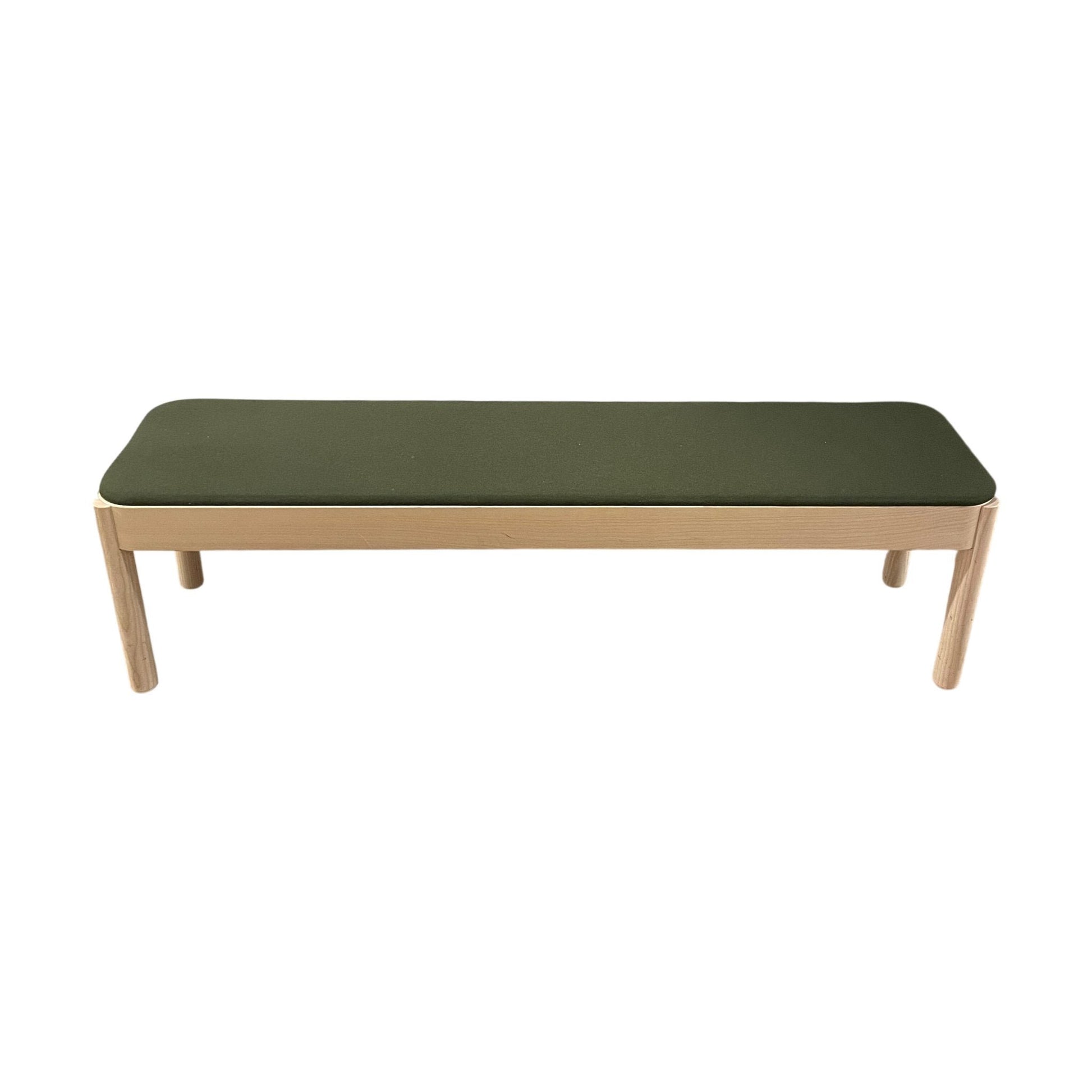 Benk med grønt tekstiltrekk pute og lys treunderstell. Den stilrene designen gjør dette til et allsidig møbel som kan brukes i ulike rom i hjemmet. Den lange sitteflaten gir plass til flere personer og er perfekt for både spisestuer og gangarealer.Benkens form passer godt inn i moderne interiører, med fokus på minimalisme og funksjonalitet.
