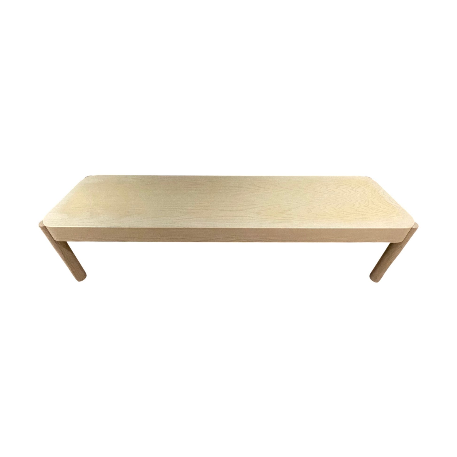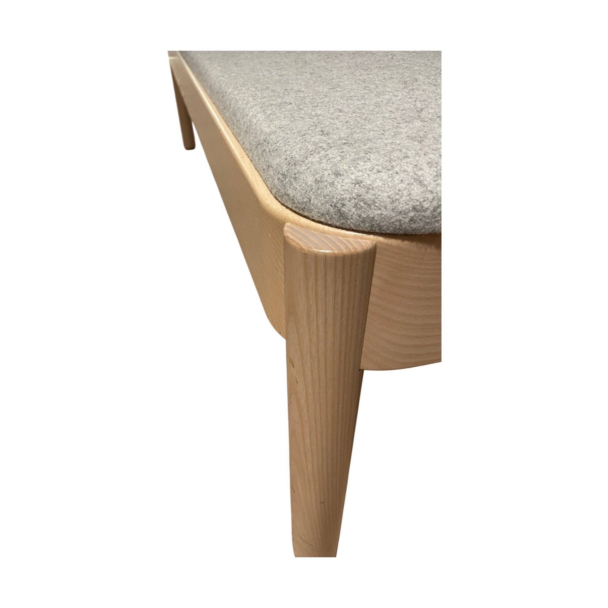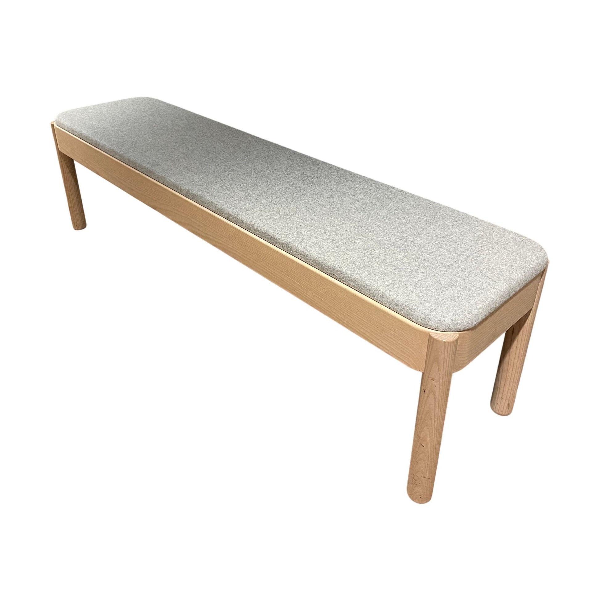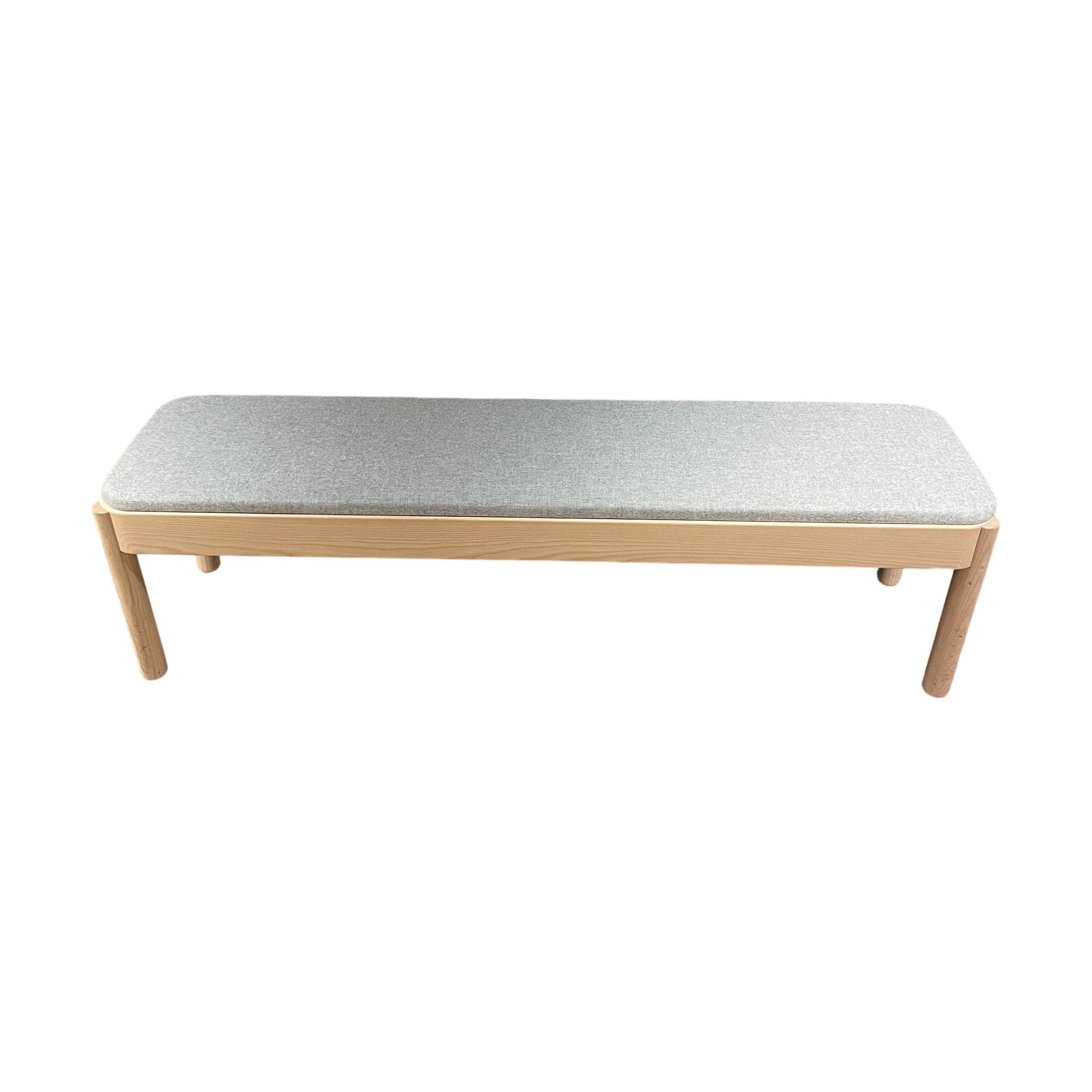 Benk med grått stofftrekk på pute og lyse trematerialer. Den polstrede sitteflaten gir komfort, og de robust konstruerte, skrå beinene gir god stabilitet.