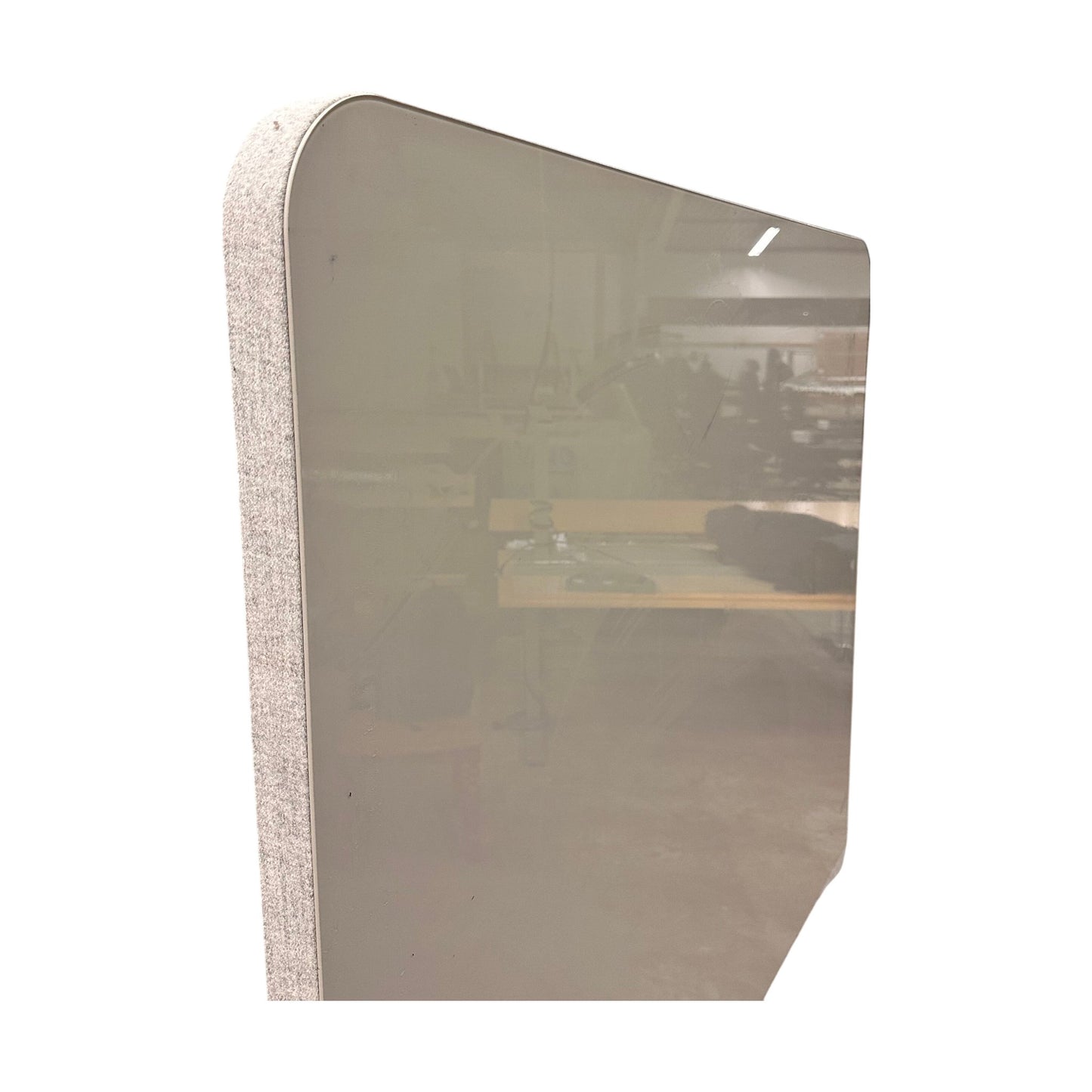 Whiteboardet er i god stand med minimale tegn på slitasje. Overflaten er lett å rengjøre, og hjulene fungerer uten problemer, noe som gjør det enkelt å flytte rundt i rommet.