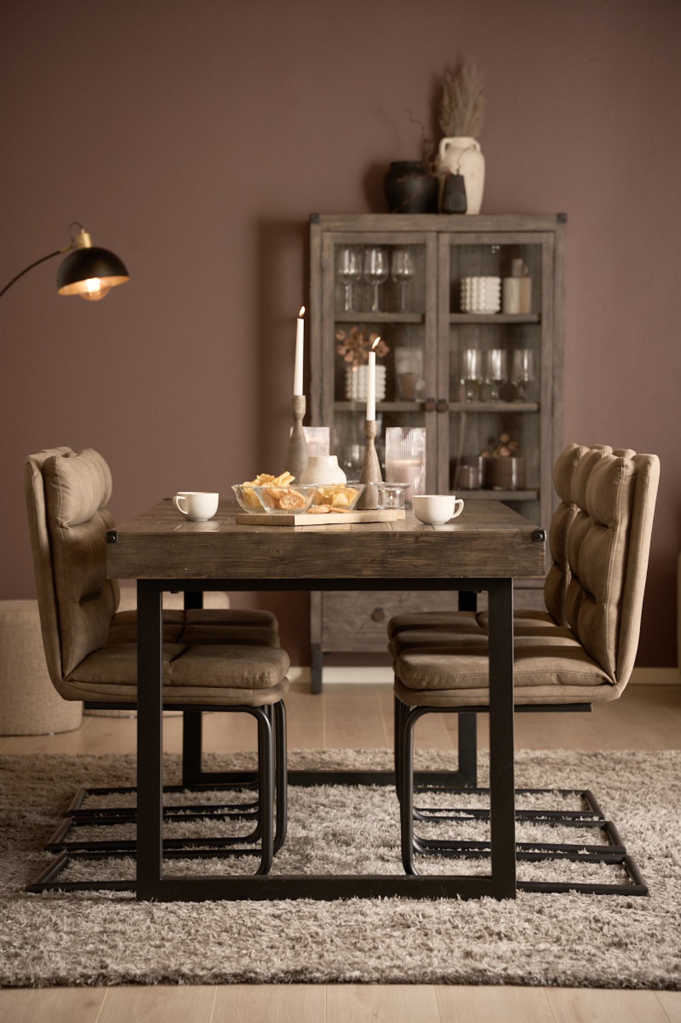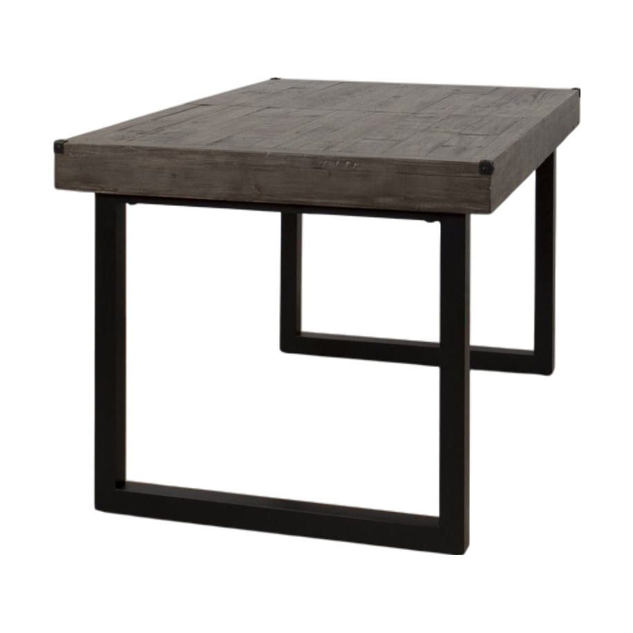 Spisebordet i resirkulert treverk fra Woodenforge byr på en rustikk og industriell stil, med solide svarte ben i metall. Den praktiske ileggsplaten gjør det enkelt å tilpasse bordet til dine behov, perfekt for både hverdags og fest.