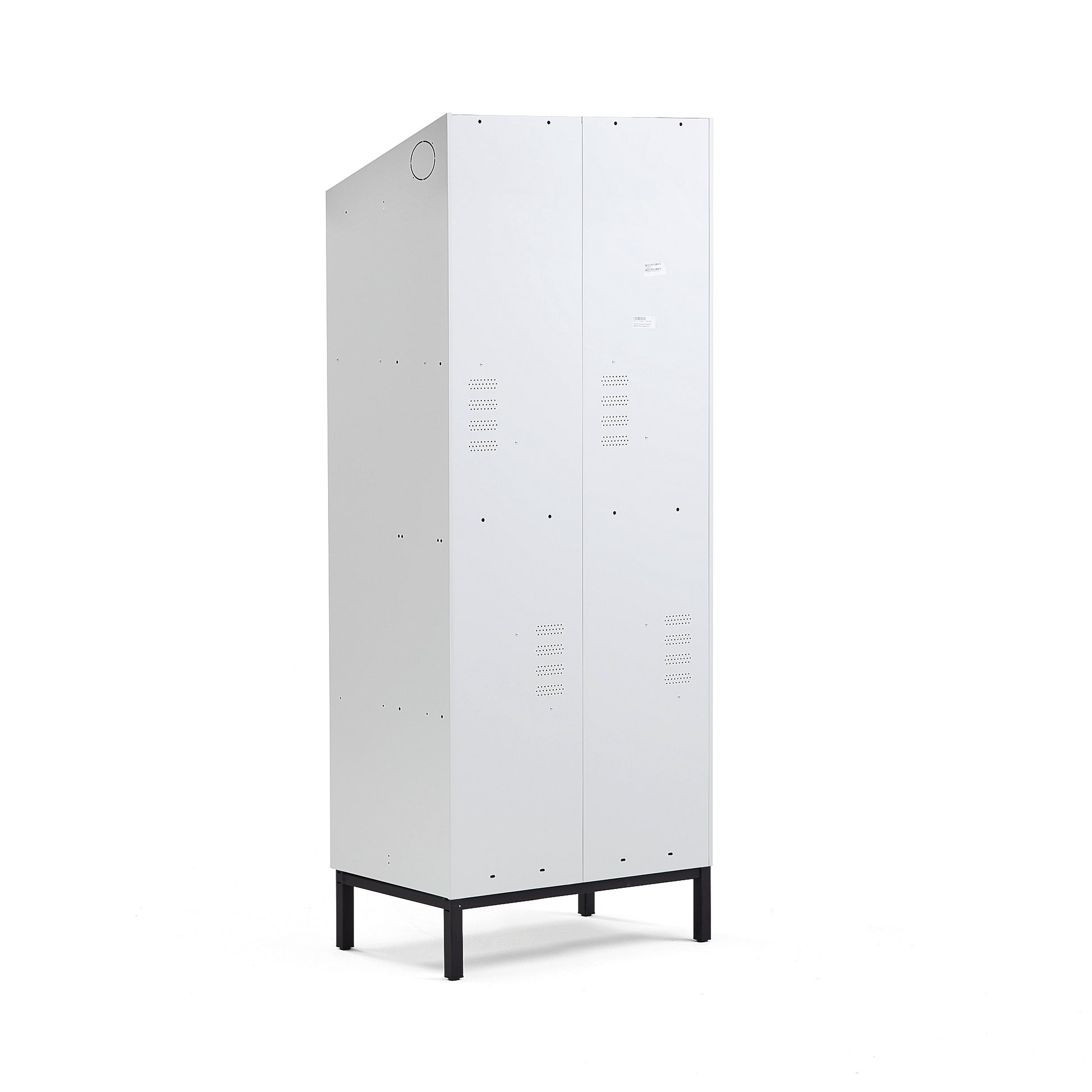 Praktisk Z-skap CLASSIC designet for kontoret med to seksjoner, hver med rom som har dørstopper, ankerkrok og ventilasjon for optimal oppbevaring. Leveres med et solid benstativ og har et moderne, stilrent uttrykk i svart og lys grå.