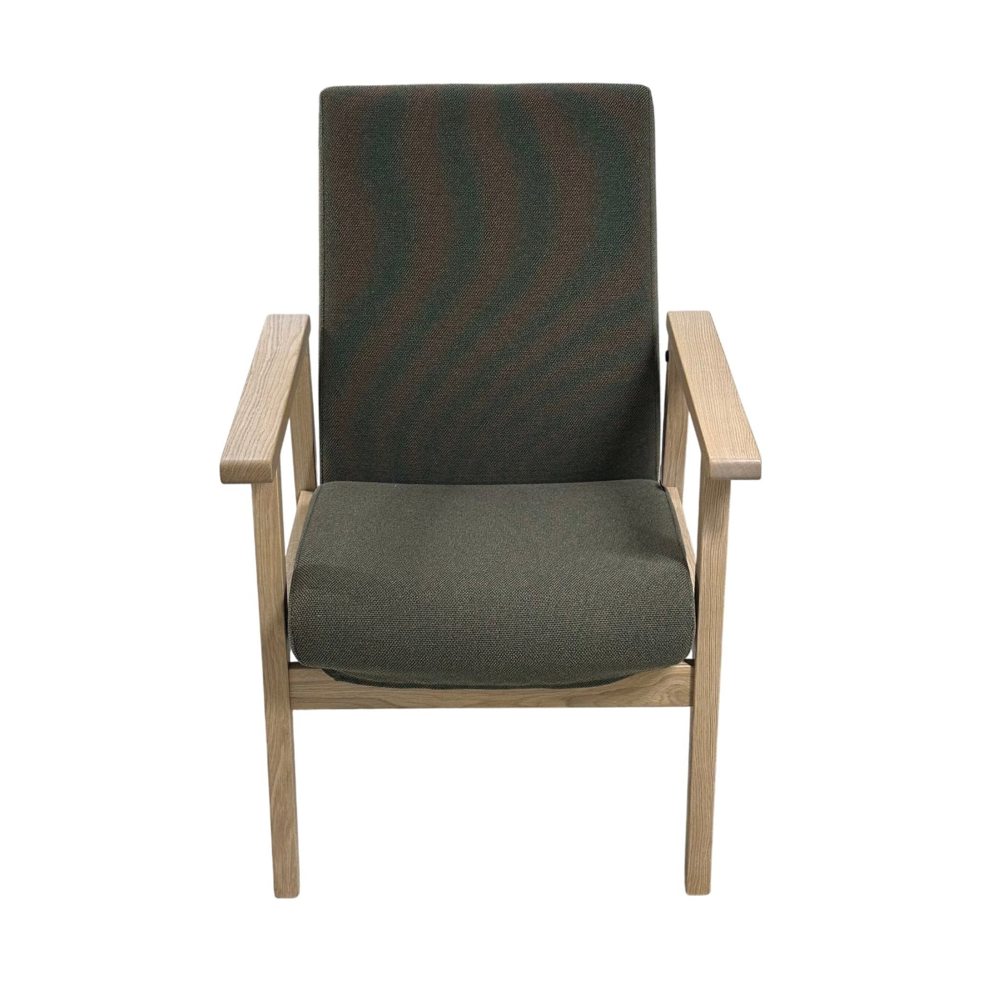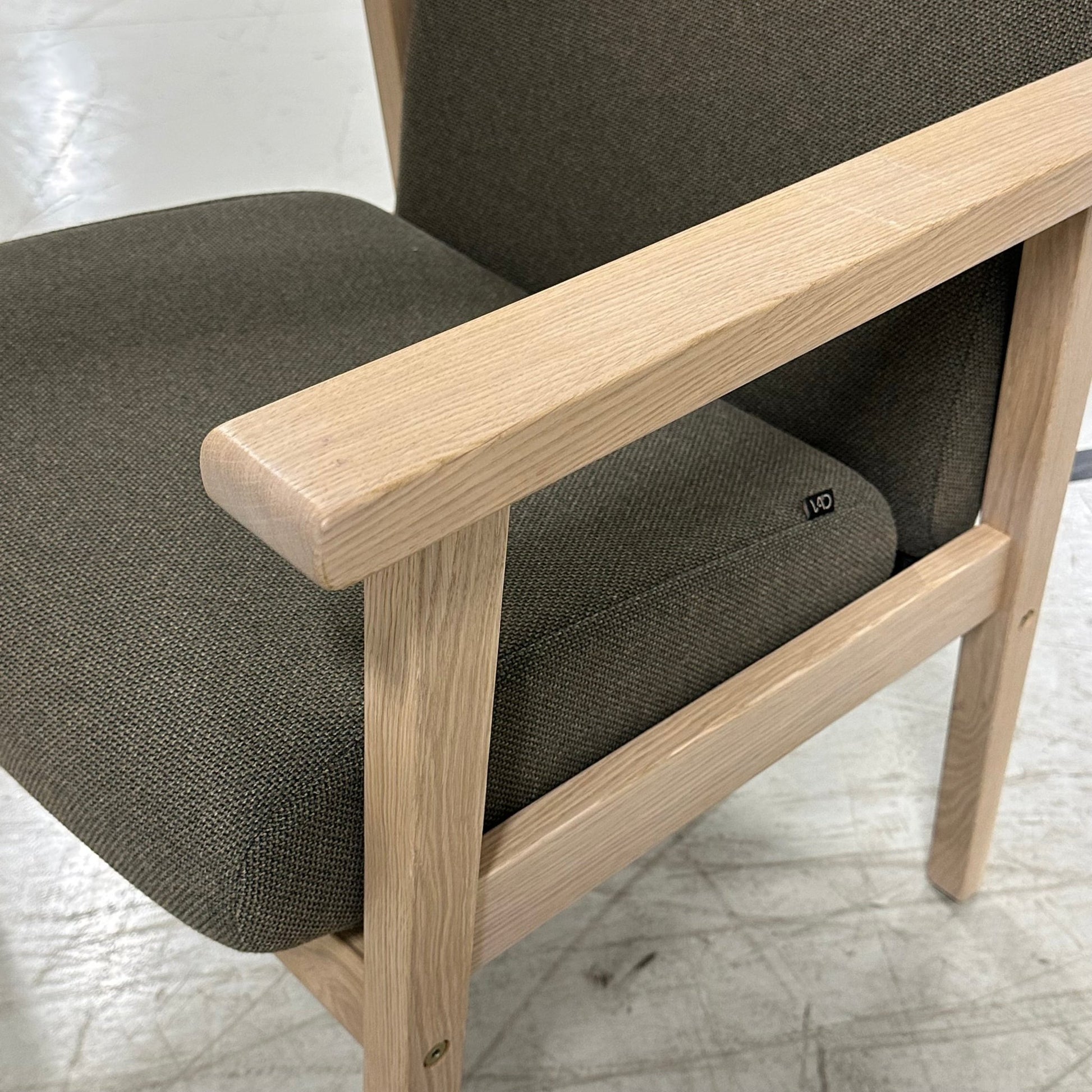 Lenestolen er i utmerket tilstand, med lite synlige brukstegn. Stoffet under puten er noe løst, men dette påvirker ikke bruken og er ikke synlig når stolen ses fra siden. Ingen flekker eller merkbare skader er å finne.